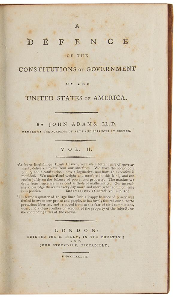Extremely rare pair of signed books: A Defence of the Constitutions of the United States America, Volumes I and II [of three], by John Adams. First edition. London: Printed for C. Dilly (Vol. I) and C. Dilly and John Stockdale (Vol. II), 1787. Hardcovers bound in full brown calf, 5.5 x 8.5, 392 pages (Vol. I) and 451 pages (Vol. II). Signed and inscribed on the first free end page of both volumes in ink by John Adams to his cousin, "Miss Hannah Adams, from The Author." Subsequently inscribed by Hannah Adams to her nephew, Thomas Adams Hill. In very good to fine condition, with foxing to the signed page. Book condition: VG-/None, with professionally mended hinges and headcaps, some scratches to leather, moderate foxing throughout, and 19th-century ownership inscriptions to front pastedowns. Accompanied by custom-made clamshell cases for each volume.