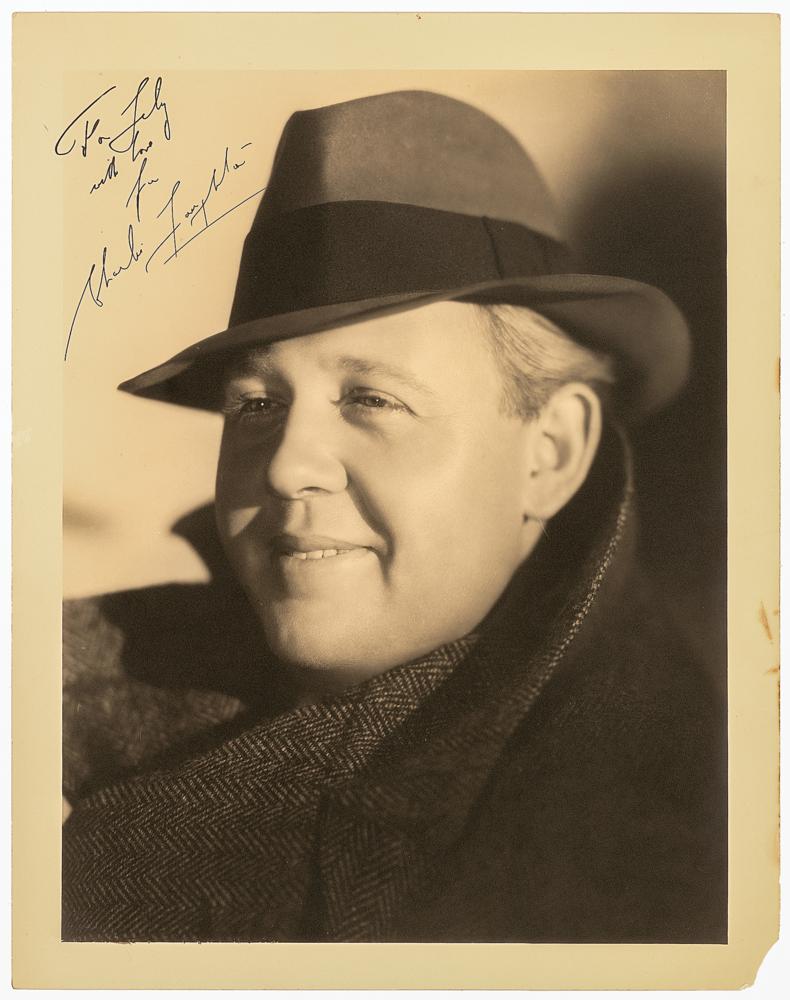 Vintage sepia matte-finish 11 x 14 close-up portrait of Laughton wearing a fedora, signed and inscribed in black ink, "To Lily, with love, from, Charlie Laughton." In fine condition, with a missing lower right corner tip.