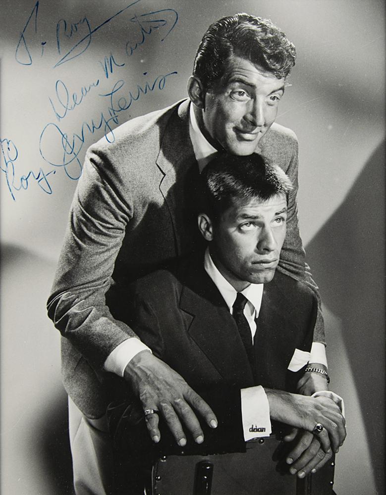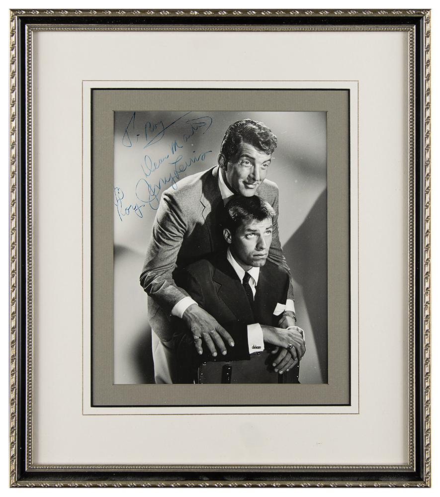 Amusing vintage glossy 6.75 x 8.75 photo of the legendary comedy team posing together, signed and inscribed in fountain pen, "To Roy, Dean Martin" and "To Roy, Jerry Lewis." Double-matted and framed to an overall size of 13.5 x 15.5. In fine condition, with a crease to the upper portion.