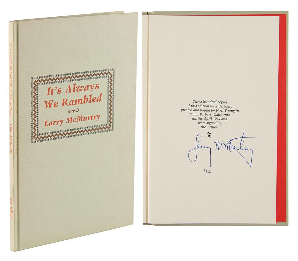 Signed book: It's Always We Rambled. Limited edition, numbered 162/300. NY: Frank Hallman, 1974. Hardcover, 5.75 x 8.75, 25 pages. Signed on the colophon in blue ballpoint by Larry McMurtry. In fine condition.