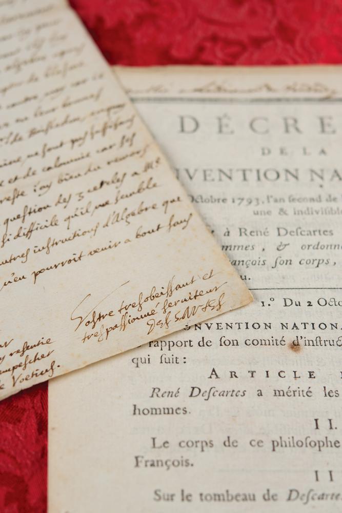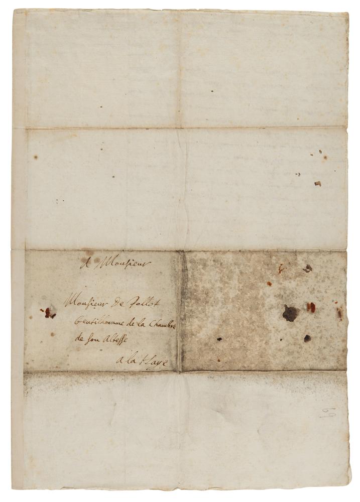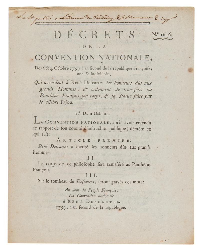 Addressed on the integral leaf in Descartes' hand to "Monsieur Alphonse de Pollot, Gentilhomme de la Chambre de son Altesse à la Haye." Housed in a custom-made slipcase. The letter is in fine condition, with intersecting folds and several small holes affecting the blank margin and address panel. Accompanied by full transcript in French, and an official French brochure published by the Imprimerie Nationale Exécutive du Louvre containing the decrees of the National Convention of October 2nd and 4th, 1793, granting "René Descartes the honors due to great men, & order to transfer to the Panthéon François his body, & his statue made by the famous Pajou."