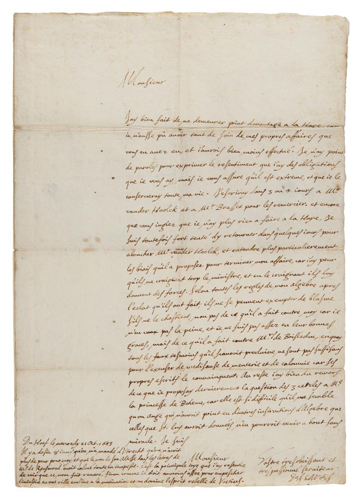 Excessively rare and mathematically significant ALS in French, signed “Descartes,” one page, 8.5 x 12.25, October 21, 1643. Handwritten letter to his friend Alphonse de Pollot, alluding to one of his mathematical theories, the Theorem of Circles (a premise to what is known today as Descartes’ Theorem), and sending thanks for his support in the Quarrel of Utrecht. Descartes vilifies his Protestant enemy at Utrecht, Gisbertus Voetius, and notes that he had recently proposed the 'Problem of Apollonius'—a famous mathematical problem involving the construction of a circle within a plane—to Princess Elisabeth of Bohemia, but fears it may be too difficult for her to solve.