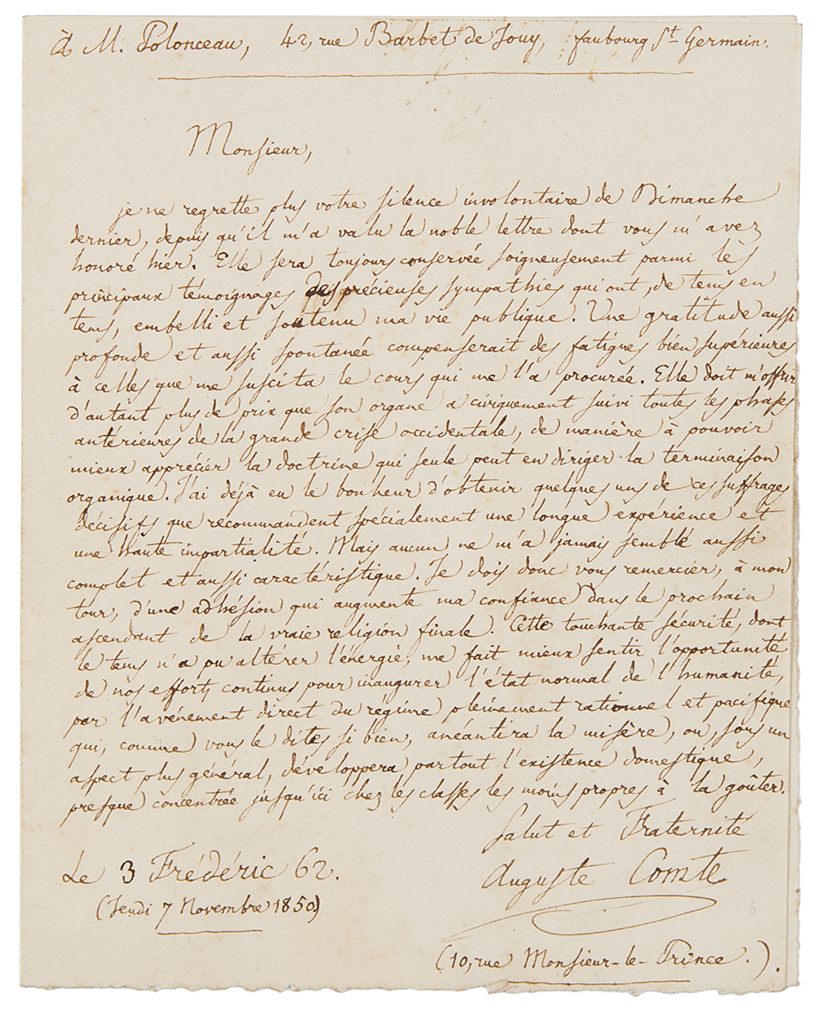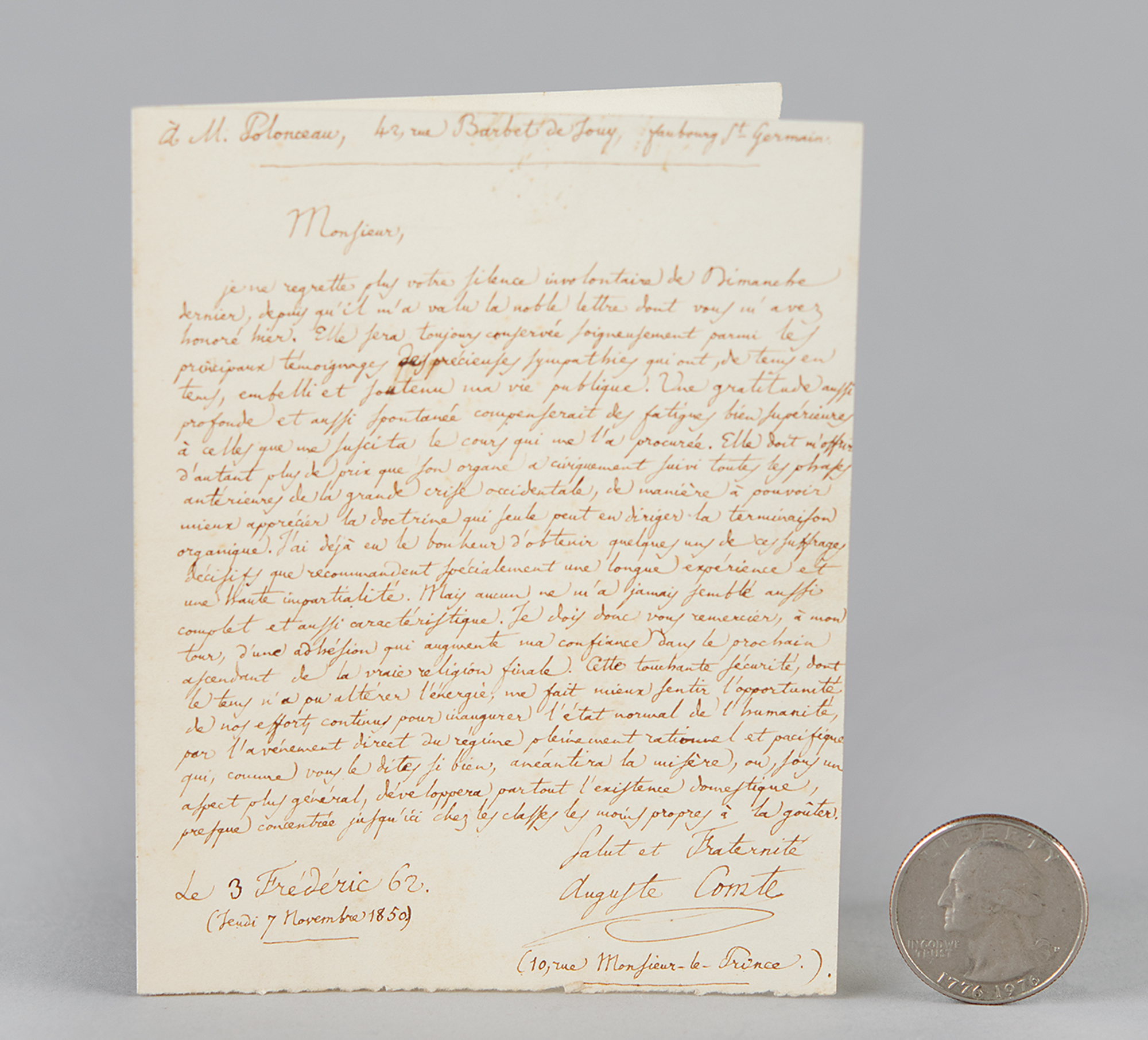 Important French philosopher, mathematician, and writer (1798-1857) who formulated the doctrine of positivism, is often regarded as the first philosopher of science, and contributed to the development of sociology as a discipline. Extremely rare ALS in French, one page, 3.25 x 4.25, November 7, 1850. Untranslated handwritten letter by August Comte. In fine condition.