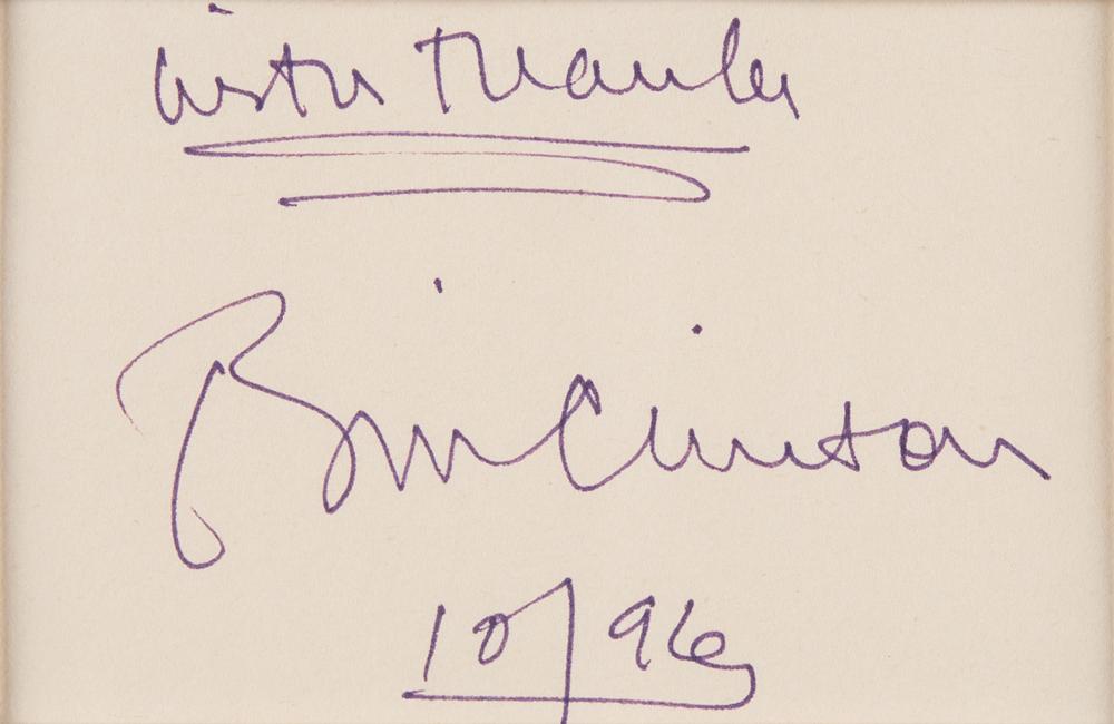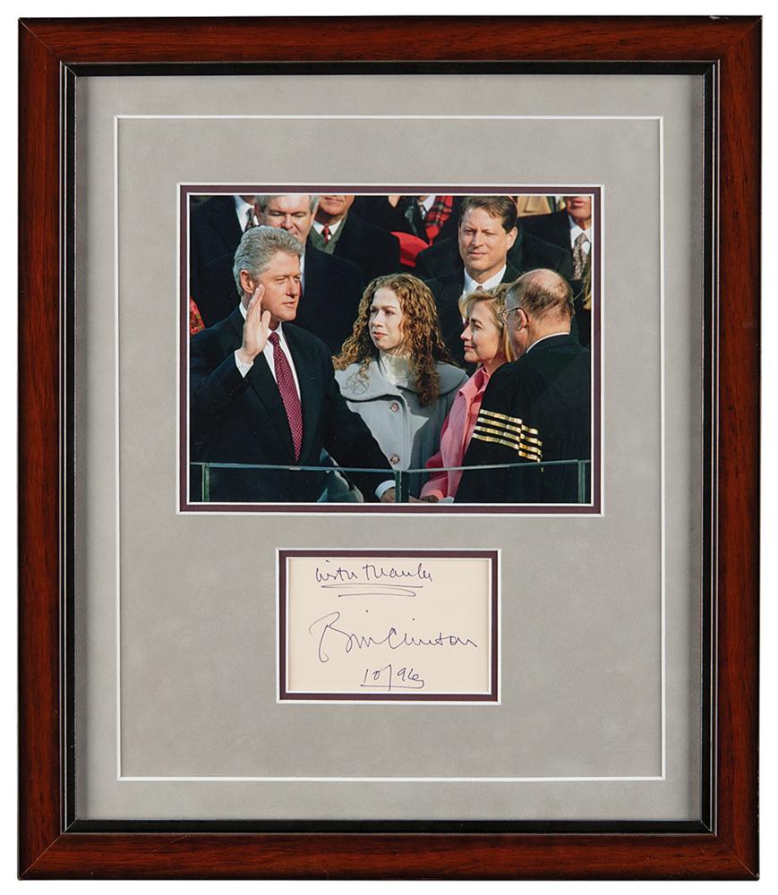 Desirable felt tip signature as president, "With thanks, Bill Clinton, 10/96,” on an off-white 3.5 x 2.25 slip. Handsomely double-matted and framed with a photo from his inauguration to an overall size of 13.25 x 15.25. In very fine condition.