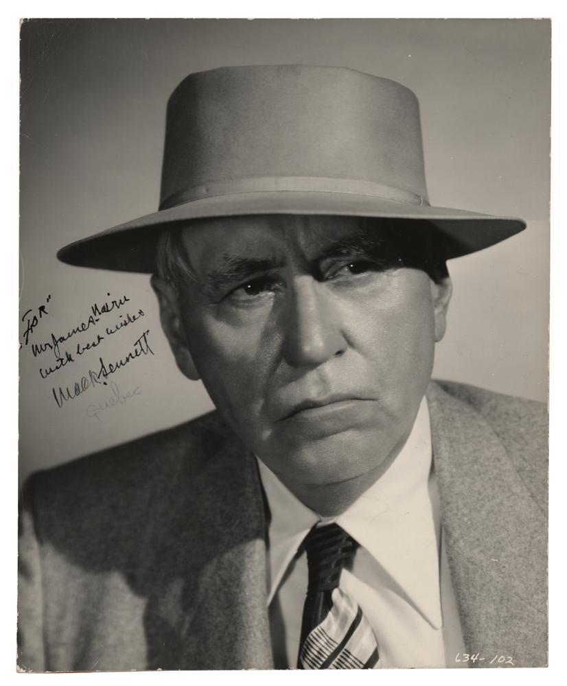 Canadian-American filmmaker and studio head (1880-1960) who opened Keystone Studios, the first fully enclosed film stage, and was the originator of slapstick routines such as pie-throwing and car-chases; in 1938, he was presented with an honorary Academy Award for his contribution to film comedy. Vintage glossy 7.5 x 9.25 close-up photo of Sennett with a straight face and a wide-brimmed hat, signed and inscribed in black ink, "with best wishes, Mack Sennett.” Affixed to a same-size mount and in very good to fine condition, with neatly trimmed edges, scattered light creasing, and some crazing to the emulsion.