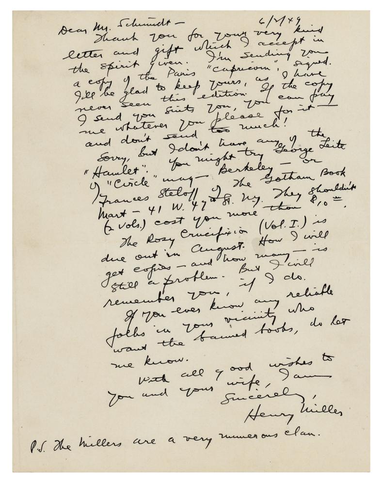ALS, one page, 8.5 x 11, June 2, 1949. Handwritten letter to E. E. Schmidt in Milwaukee, Wisconsin, in part: "I'm sending you a copy of the Paris 'Capricorn,' signed. I'll be glad to keep yours, as I have never seen this edition. If the copy I send you suits you, you can pay me whatever you please for it—and don't send too much. Sorry, but I don't have any of the 'Hamlet.' You might try George Leite of 'Circle'?or Frances Steloff of The Gotham Book Mart?They shouldn't (2 vols.) cost you more than $10.00. The Rosy Crucifixion (Vol. I) is due out in August. How I will get copies—and how many—is still a problem. But I will remember you, if I do. If you ever know any reliable folks in your vicinity who want the banned books, do let me know." In fine condition. Accompanied by the original mailing envelope, addressed in Miller's own hand.