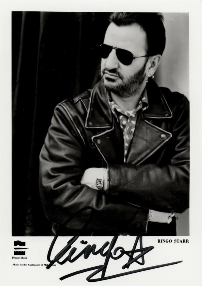 Satin-finish 4 x 5.5 Private Music promotional photo of Ringo Starr wearing a leather jacket and sunglasses in a half-length pose, signed in the lower border in black felt tip, “Ringo,” with star sketch. The consignor notes that the signature was obtained by in-person autograph collector Clive Bullimore in London, England. In very fine condition. Accompanied by a certificate of authenticity from Tracks.