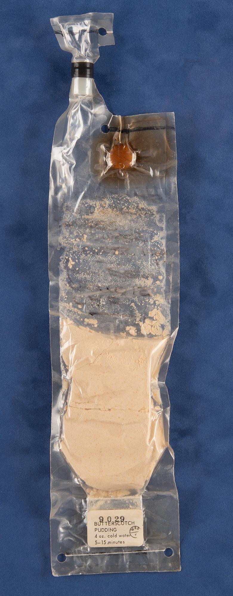 The meals on Apollo 12 were comprised of more than 70 items, ranging from rehydratable freeze-dried items, wet-pack and spoon-bowl foods, and meals ready to eat. The food for the Apollo missions was prepared and packaged by the Whirlpool Corporation in conjunction with the U.S. Army Laboratory in Natick, Massachusetts. A wet-pack example like this butterscotch pudding required the astronauts to inject water into the food bag using a water gun. The package would then be cut open with scissors and consumed.