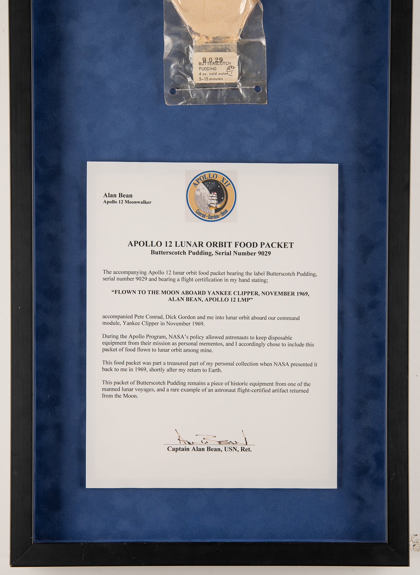 Alan Bean’s flown food packet of butterscotch pudding that was carried into lunar orbit aboard the Command Module Yankee Clipper during the historic Apollo 12 mission. The packet, 3.25˝ x 15˝, with parts/instruction label to the bottom section, “9029, Butterscotch Pudding, 4 oz. cold water, 5-15 minutes,” features very faint felt tip notations made by Bean, whose signature and handwriting are now almost entirely indiscernible. An included photo depicts the packet with Bean’s then-bold handwriting, which certifies flown status and reads: “Flown to the moon aboard Yankee Clipper, November 1969, Alan Bean, Apollo 12 CMP.” Included with the packet is a signed letter of authenticity from Bean, which reads, in part: “The accompanying Apollo 12 lunar orbit food packet bearing the label Butterscotch Pudding, serial number 9029 and bearing a flight certification in my hand…accompanied Pete Conrad, Dick Gordon and me into lunar orbit aboard our command module, Yankee Clipper in November 1969. During the Apollo Program, NASA's policy allowed astronauts to keep disposable equipment from their mission as personal mementos, and I accordingly chose to include this packet of food flown to lunar orbit among mine. This food packet was a treasured part of my personal collection when NASA presented it back to me in 1969, shortly after my return to Earth. This packet of Butterscotch Pudding remains a piece of historic equipment from one of the manned lunar voyages, and a rare example of an astronaut flight-certified artifact returned from the Moon.” Archivally framed together to an overall size of 13.25˝ x 32.25˝. In fine condition.