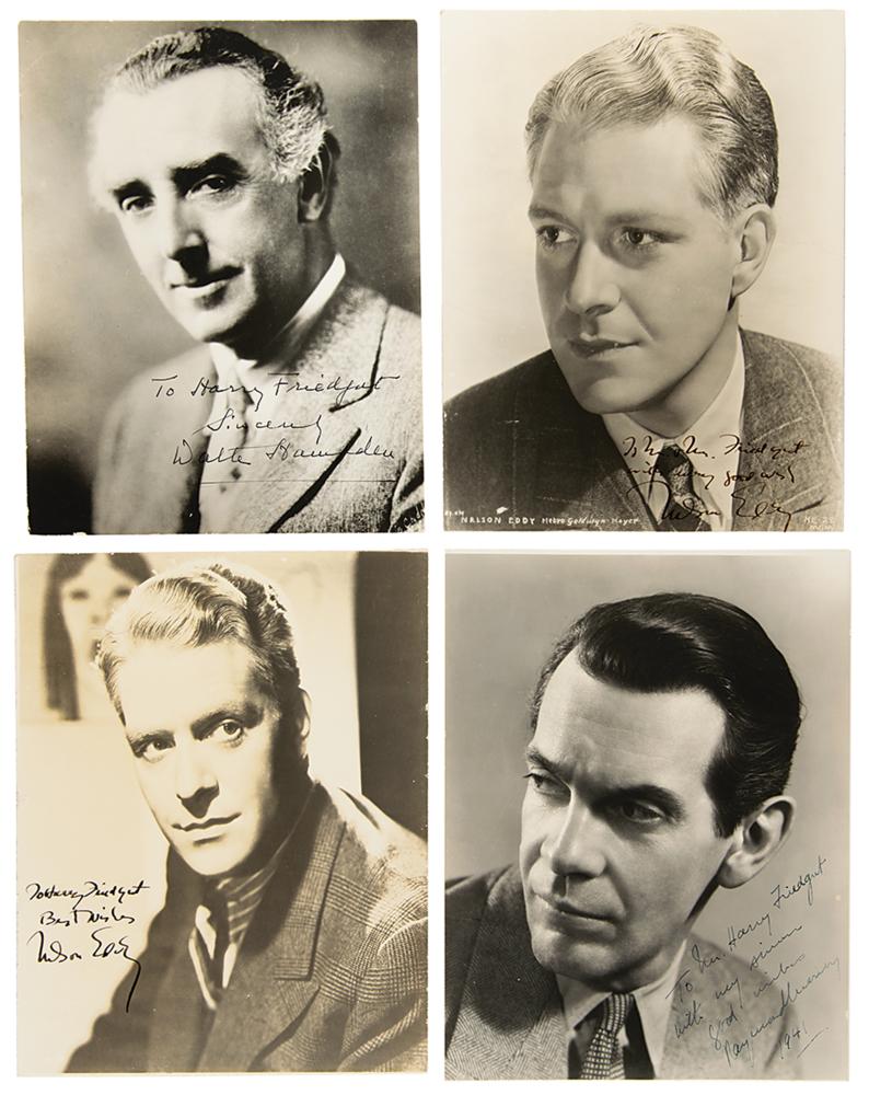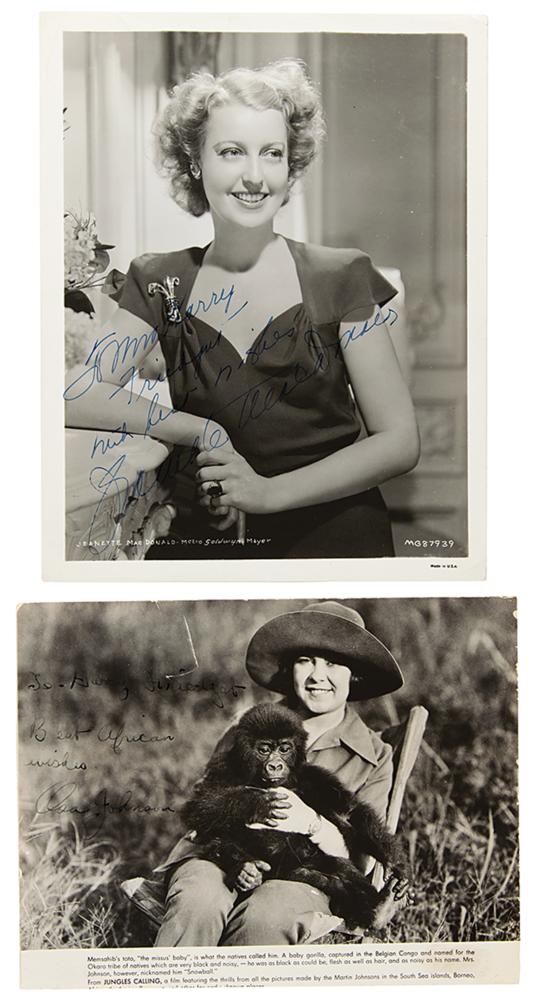Lot of six vintage photos of noted actors and actresses, ranging in size from 9 x 7 to 8 x 10, each signed and inscribed in ink or fountain pen by the pictured actor: Nelson Eddy (2), Walter Hampden, Osa Johnson, Jeanette MacDonald, and Raymond Massey. Four of the photos are affixed to a same-size cardstock mount. In overall very good to fine condition.