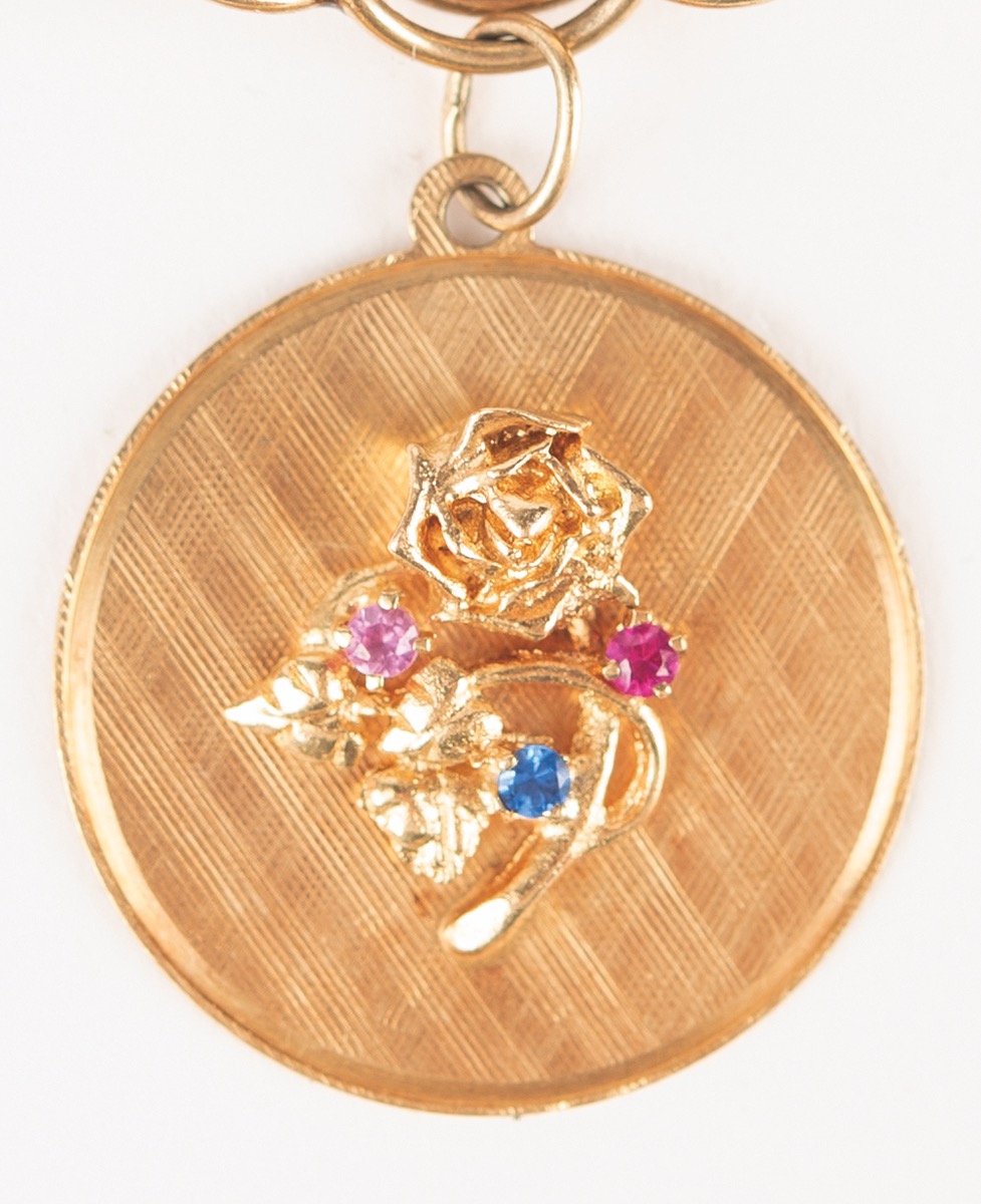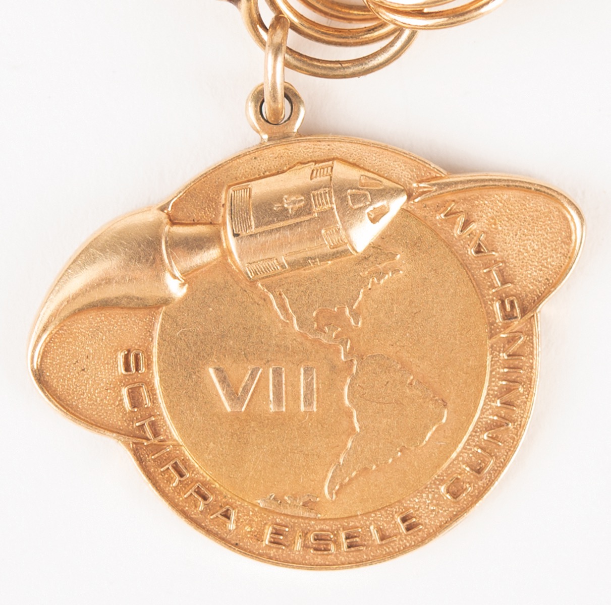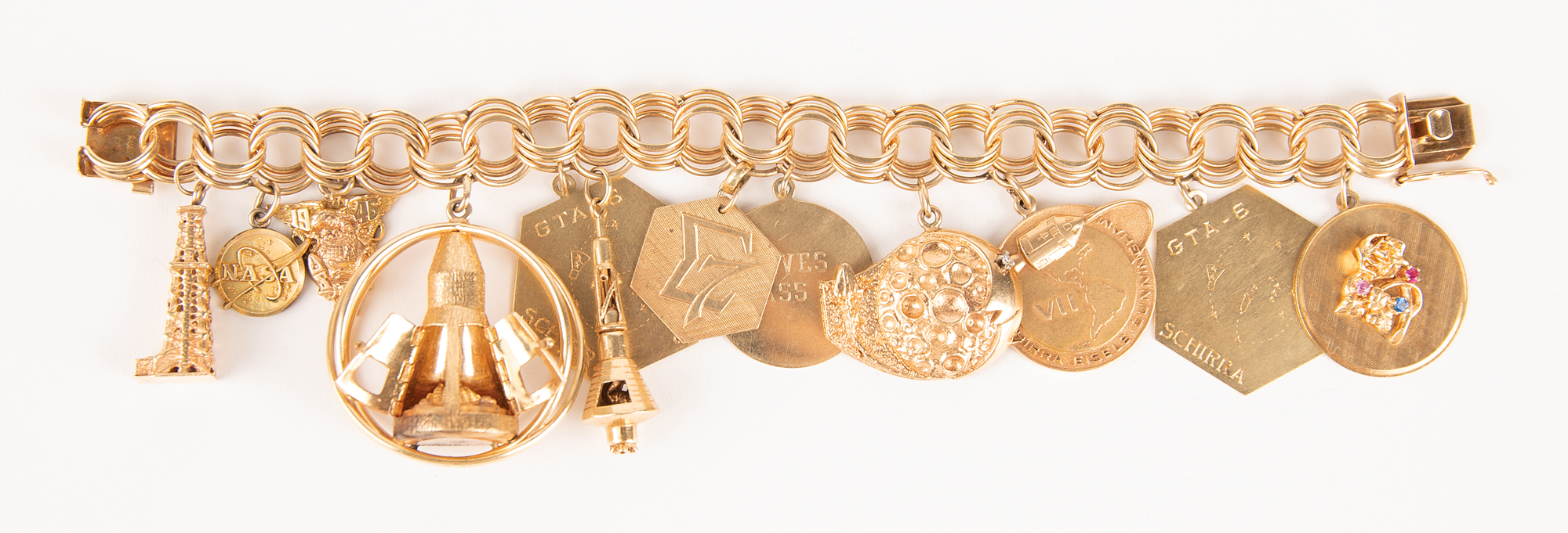 Magnificent gold charm bracelet from the collection of Jo Schirra, the wife of famed NASA astronaut Wally Schirra, featuring an assemblage of twelve golden charms, including four flown on Schirra's missions: Mercury-Atlas 8, Gemini 6, and Apollo 7. The gold bracelet is marked "14K" on the clasp and measures 7.75˝ long.