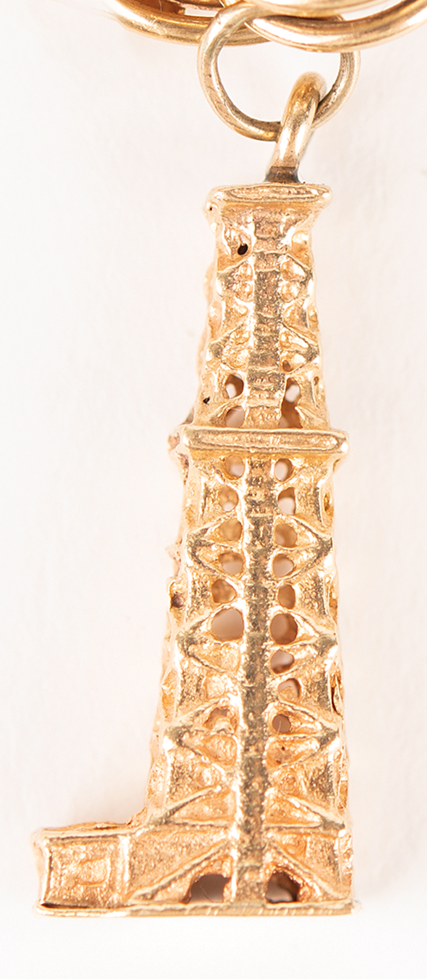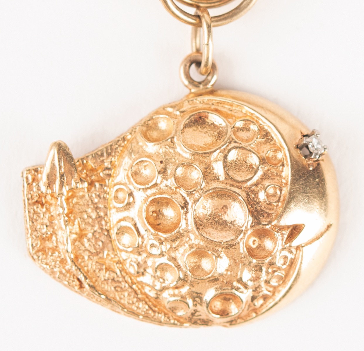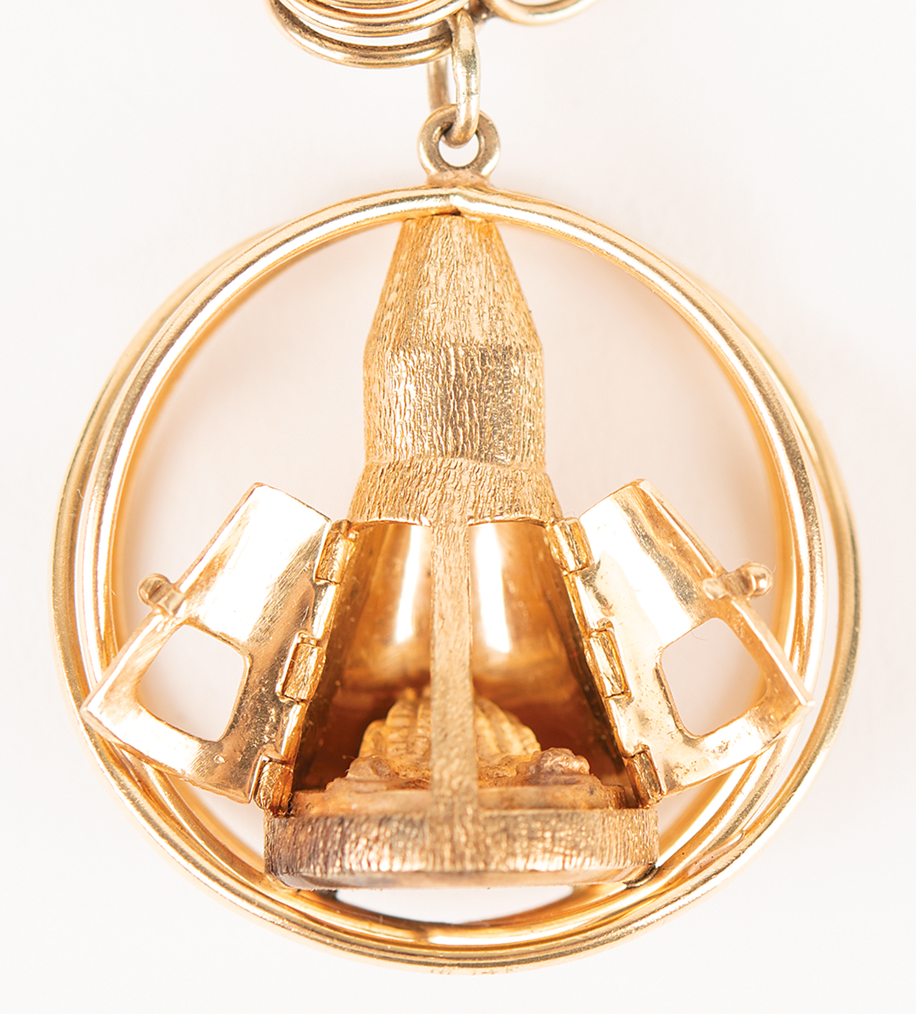 The unflown charms include: a three-dimensional 14K charm modeling a spacecraft launch tower; a gold-filled NASA 'meatball' charm; Wally Schirra's 14K gold 1946 United States Naval Academy class charm, engraved on the reverse with his fiancée's initials, "J.C.F."; a remarkable three-dimensional 14K gold charm modeling the Gemini spacecraft, with doors that open to reveal two astronauts inside; a three-dimensional 14K gold charm modeling the Mercury capsule with escape tower; a 14K gold circular charm for the 20th anniversary of the Astronaut Wives Club, engraved "Wives Class XX"; a handsome sculptural golden charm portraying a cratered lunar surface with orbiting spacecraft, featuring a small diamond inset within a crescent moon on the right edge; and a sculptural 14K gold charm featuring a flower inset with three colorful stones, engraved on the reverse: "A Day to Remember: Book & Needle Club, Oradell, N.J., 10-16-62."