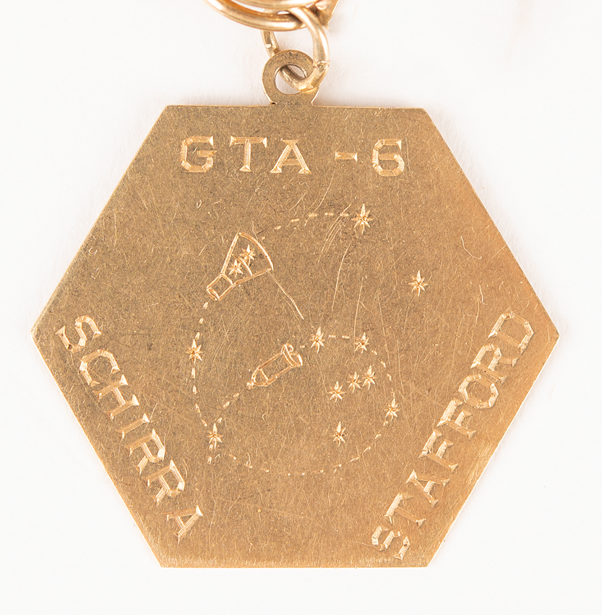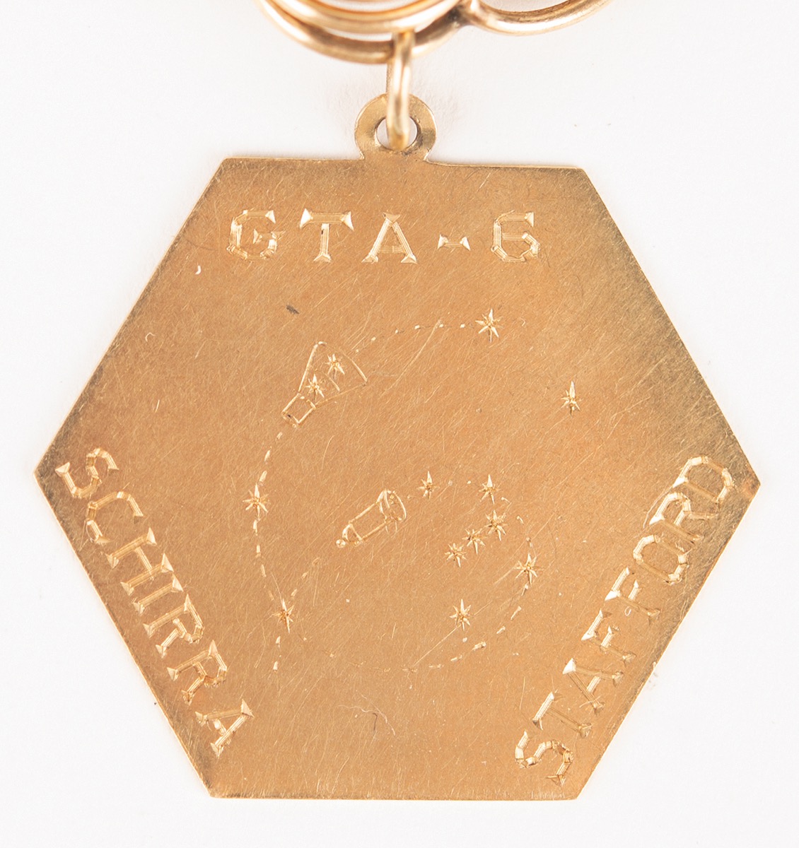 Two identical hexagonal 14K gold pendants carried aboard the Gemini SC6 spacecraft with astronauts Wally Schirra and Tom Stafford during the Gemini 6 mission. The front of each pendant is engraved with the mission’s insignia, and the reverse engraved with the launch date, “15 DEC 65.”