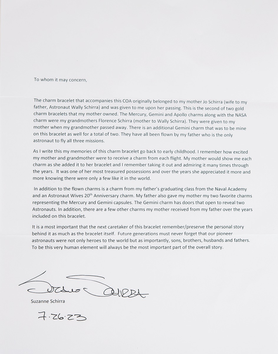 Accompanied by a detailed letter of provenance signed by Jo and Wally’s daughter, Suzanne Schirra, in part: "The charm bracelet that accompanies this COA originally belonged to my mother Jo Schirra (wife to my father, Astronaut Wally Schirra) and was given to me upon her passing. This is the second of two gold charm bracelets that my mother owned. The Mercury, Gemini and Apollo charms along with the NASA charm were my grandmother's Florence Schirra (mother to Wally Schirra). They were given to my mother when my grandmother passed away. There is an additional Gemini charm that was to be mine on this bracelet as well for a total of two. They have all been flown by my father who is the only astronaut to fly all three missions.