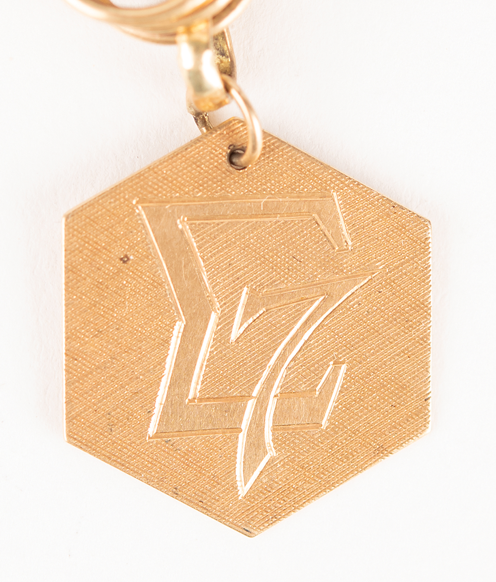 A hexagonal 14K gold pendant carried on board the Sigma 7 spacecraft with Wally Schirra during the Mercury-Atlas 8 mission. The front of the pendant features the Sigma 7 logo, and the reverse is stamped with a "14K" hallmark.