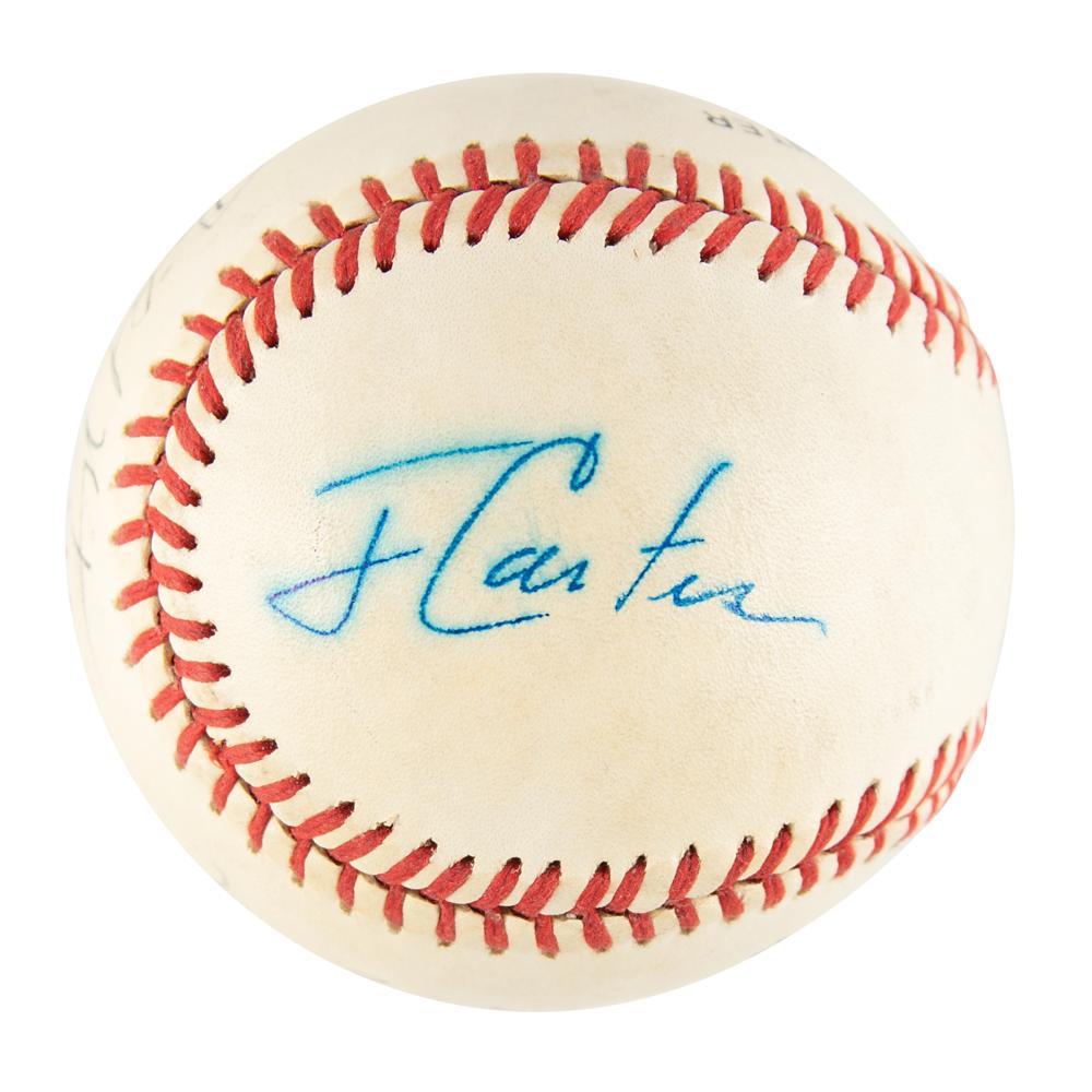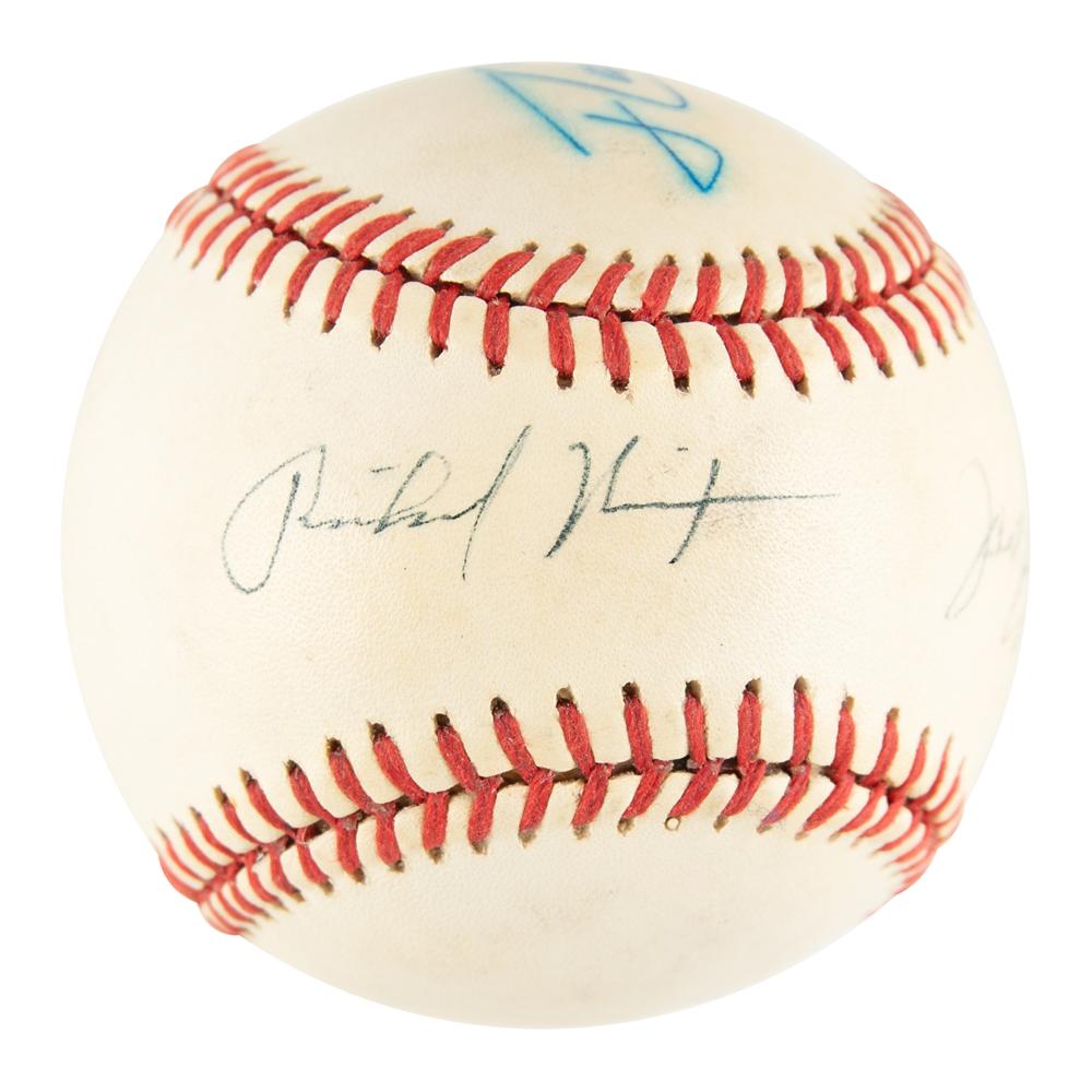 Official Rawlings National League (White) baseball signed by former American presidents Richard Nixon (on the sweet spot in black ink), Gerald Ford (on a side panel in black ballpoint as "Jerry Ford"), and Jimmy Carter (on a side panel in bright blue ink as "J. Carter"). In very good to fine condition, with light soiling, and some haloing to Carter's signature.