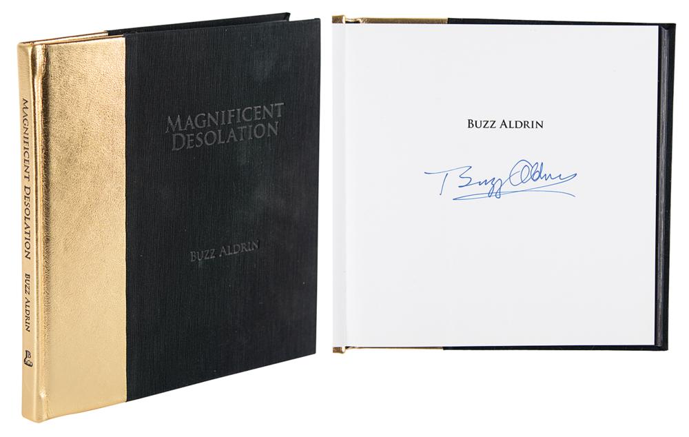 Signed book: Magnificent Desolation: Images from the Apollo 11 Lunar Mission with the Words of Astronaut Buzz Aldrin. First edition, limited issue, letter H of 26 specially bound copies. Reno, NV: Jack Bacon & Company, 2009. Hardcover, 8.25 x 8.25. Signed on the author's prefatory page in blue felt tip, "Buzz Aldrin." In very fine condition. An extraordinary collection of more than 50 photographs from the historic Apollo 11 mission interspersed with the words of Aldrin, this volume was privately printed and differs from Aldrin's similarly titled autobiography.