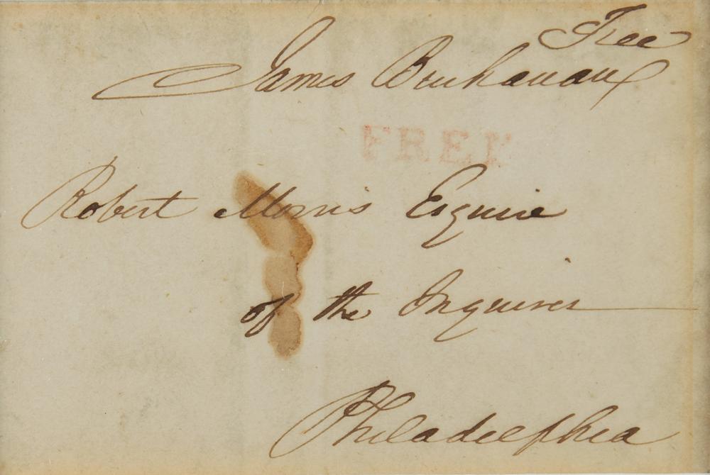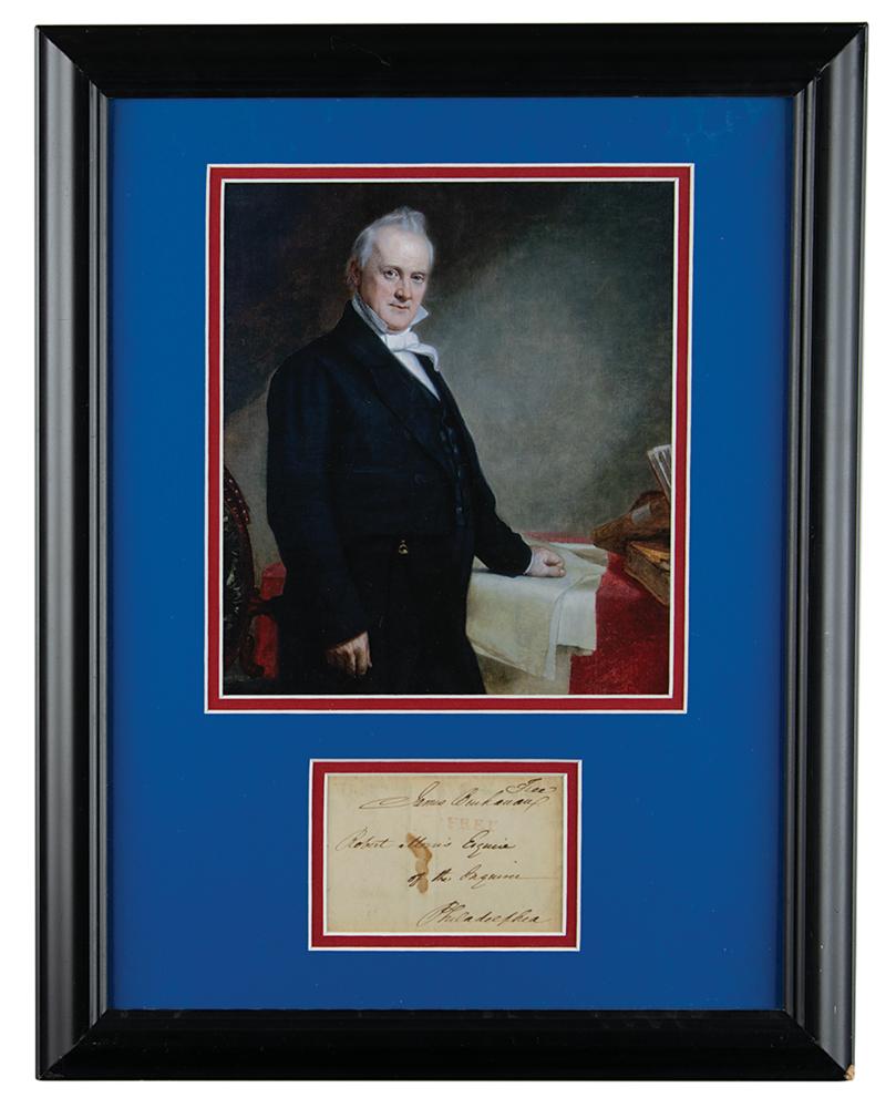 Hand-addressed and free-franked mailing panel, 4 x 3, addressed in the hand of Buchanan to "Robert Morris Esquire of the Inquiries, Philadelphia,” and franked in the upper right, "Free, James Buchanan." Double-matted and framed with a portrait to an overall size of 14.25 x 18.25. In very good to fine condition, with light creasing, and a stain to the center.