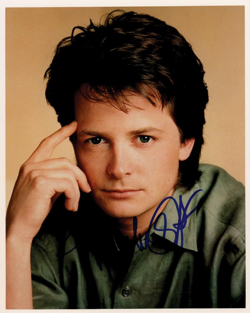 Color glossy 8 x 10 head-and-shoulders photo of Back to the Future star Michael J. Fox, signed in blue felt tip. In very fine condition.