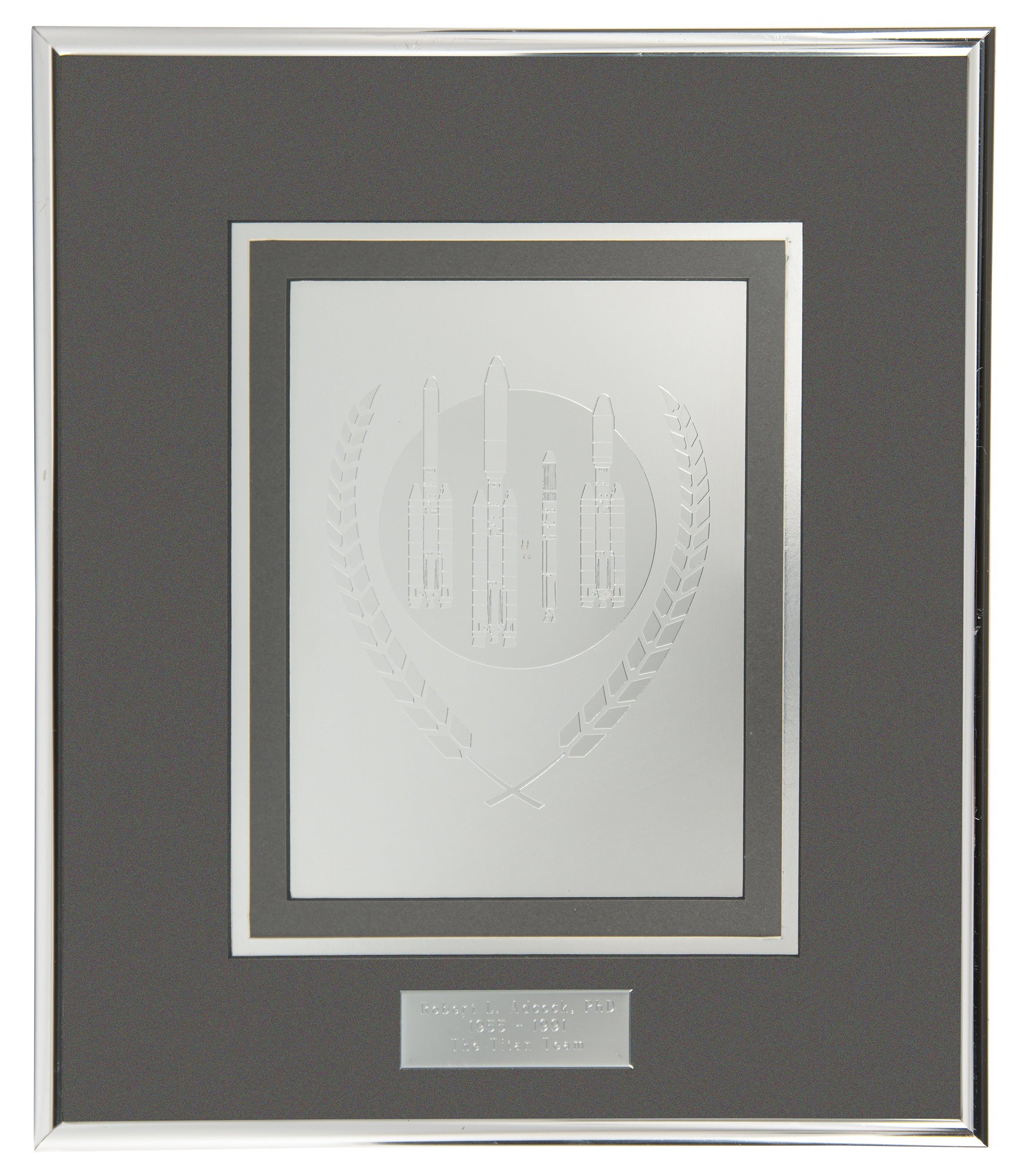 Scarce metal retirement plaque presented to Dr. Robert L. Adcock for his role in the development of the Titan expendable rocket family that launched all of the Project Gemini crewed flights of the mid-1960s. The plaque, 5.75 x 7.75, is laser-etched with a quartet of Titan rockets over a moon and surrounded by a laurel wreath. Double-matted and framed with an engraved plate, “Robert L. Adcock, PhD, 1955–1991, The Titan Team,” to an overall size of 12.25 x 14.25. In fine condition.
