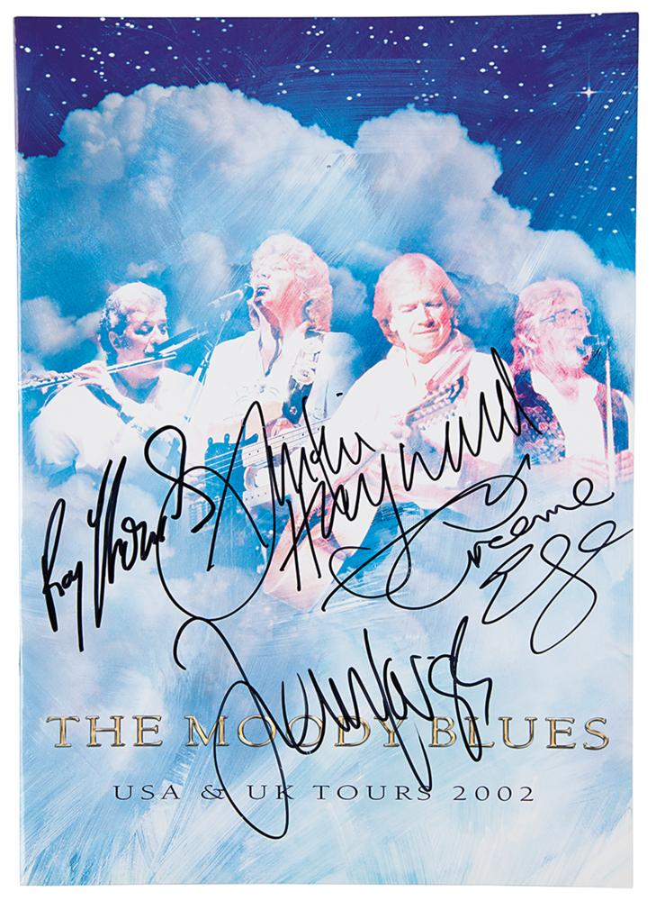 Appealing tour book for the Moody Blues’ 2002 Fall Tour of the United States, 9.5 x 13.5, signed on the front cover in black felt tip by John Lodge, Graeme Edge, Ray Thomas, and Justin Hayward. In very fine condition.