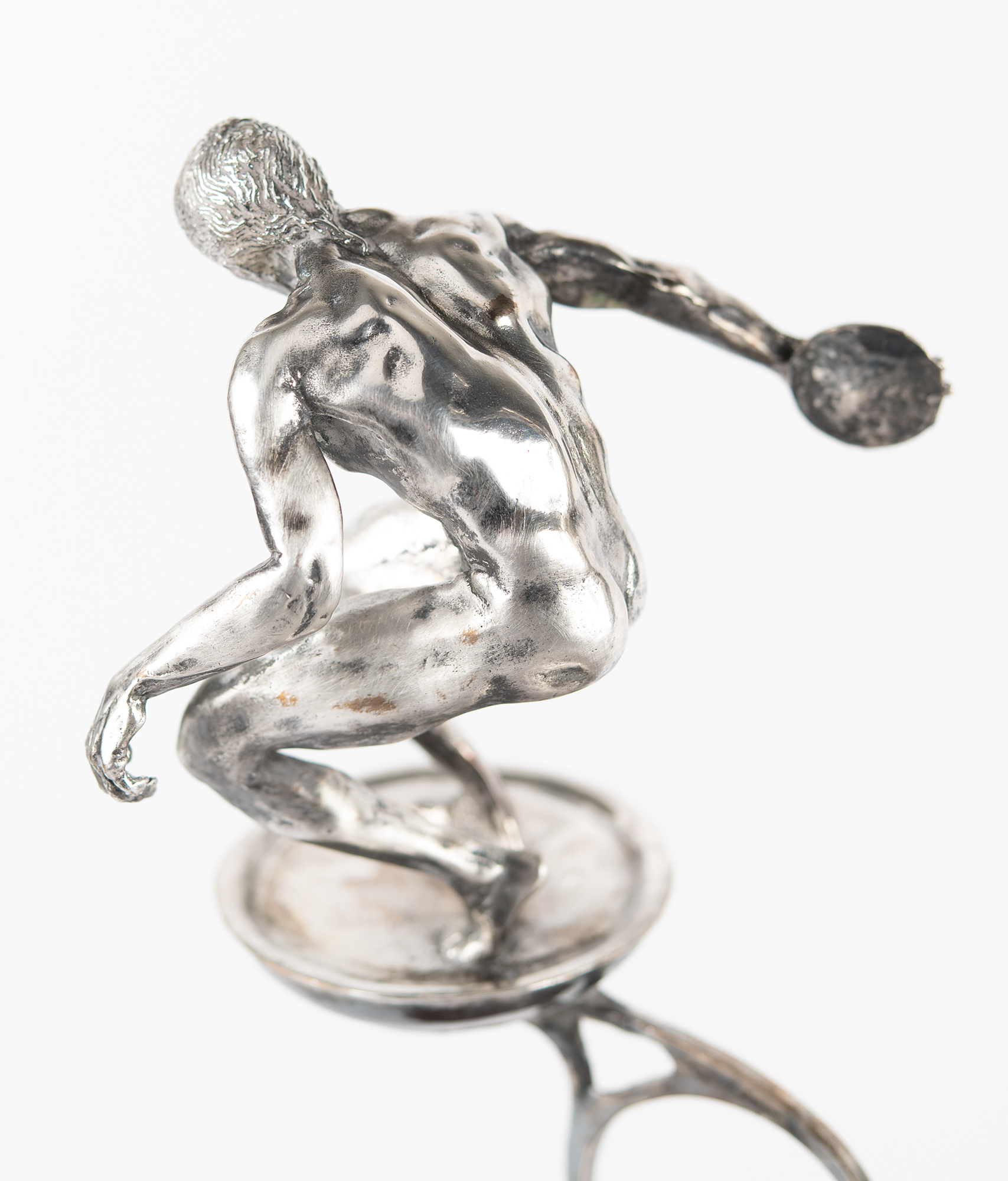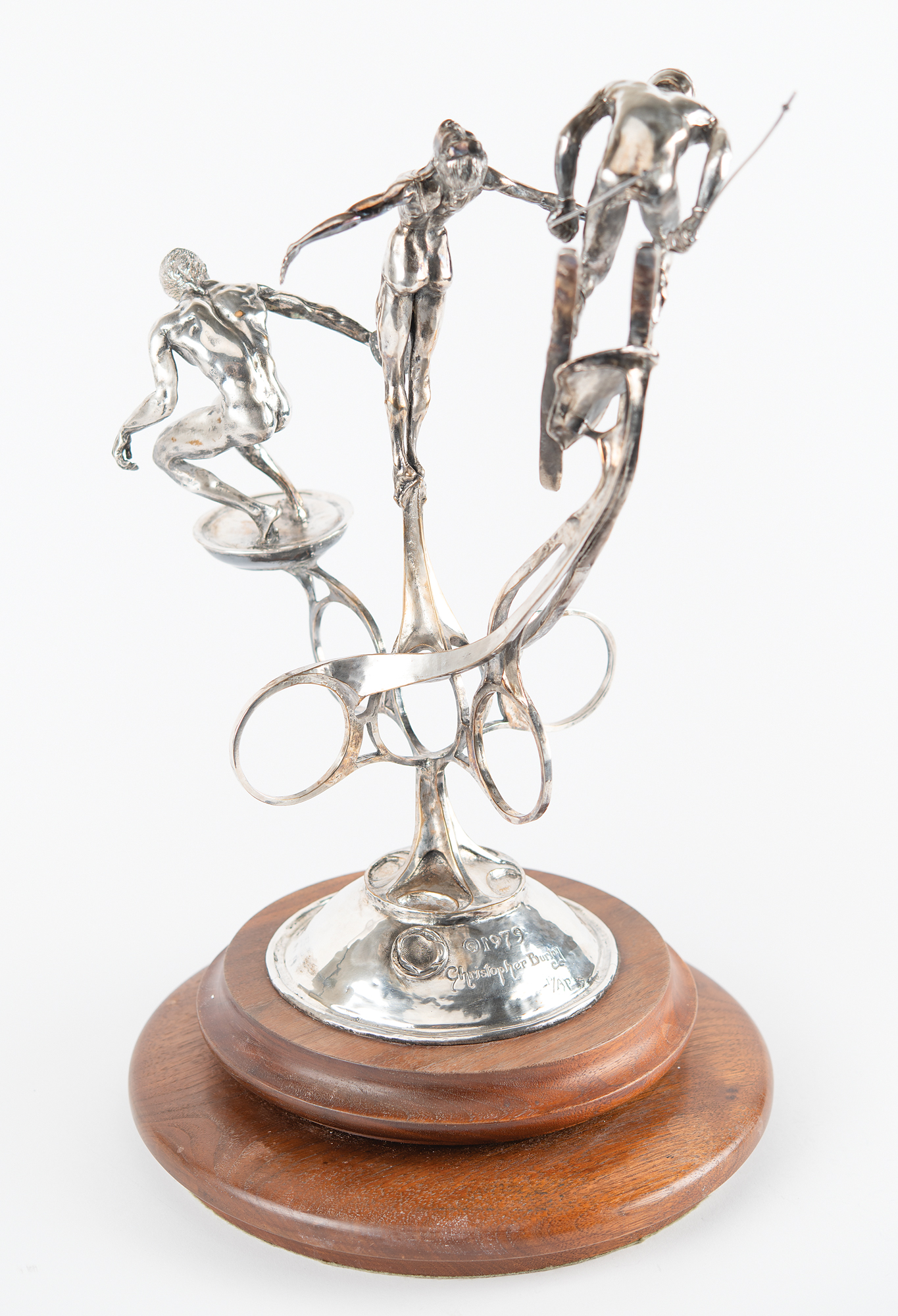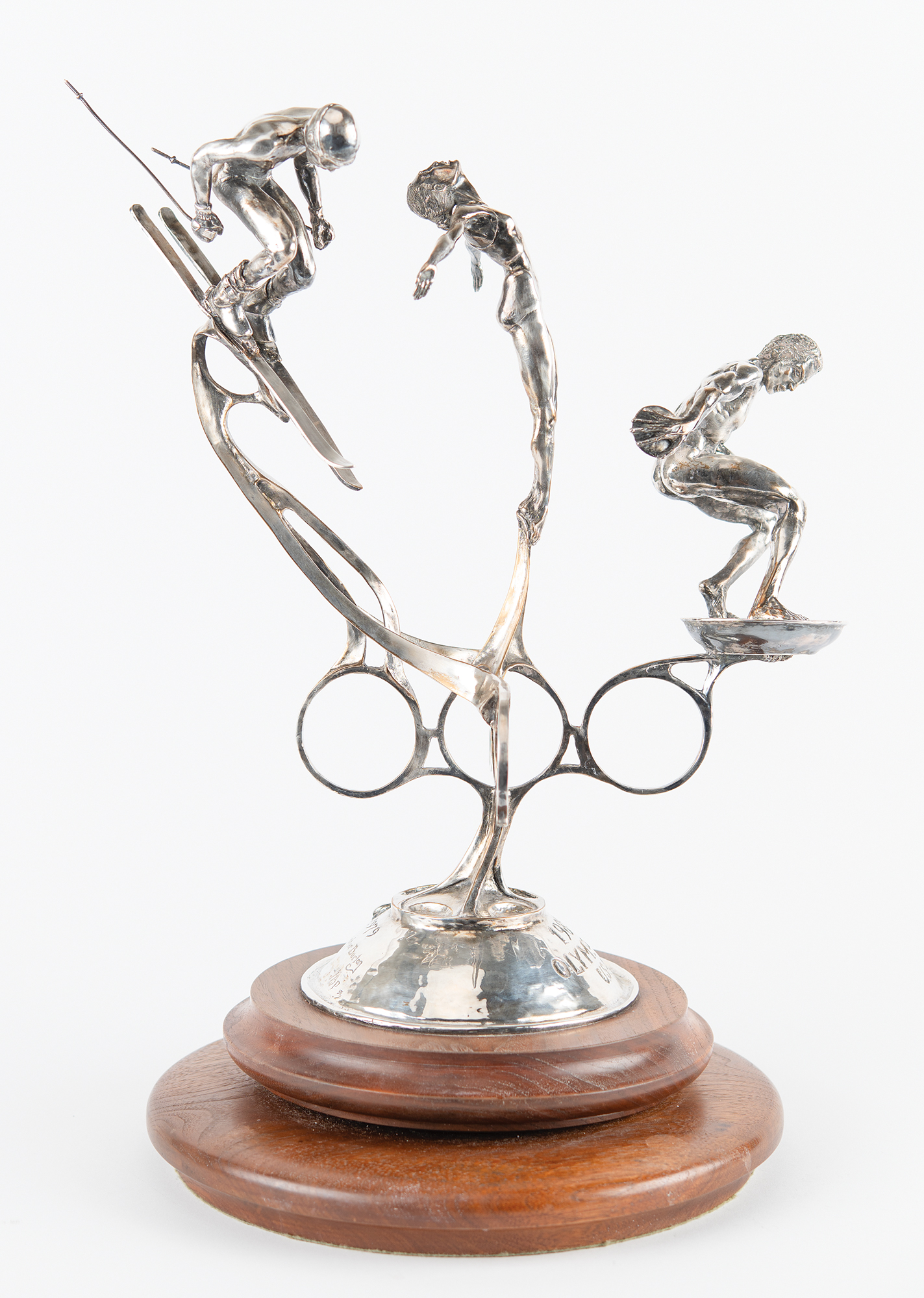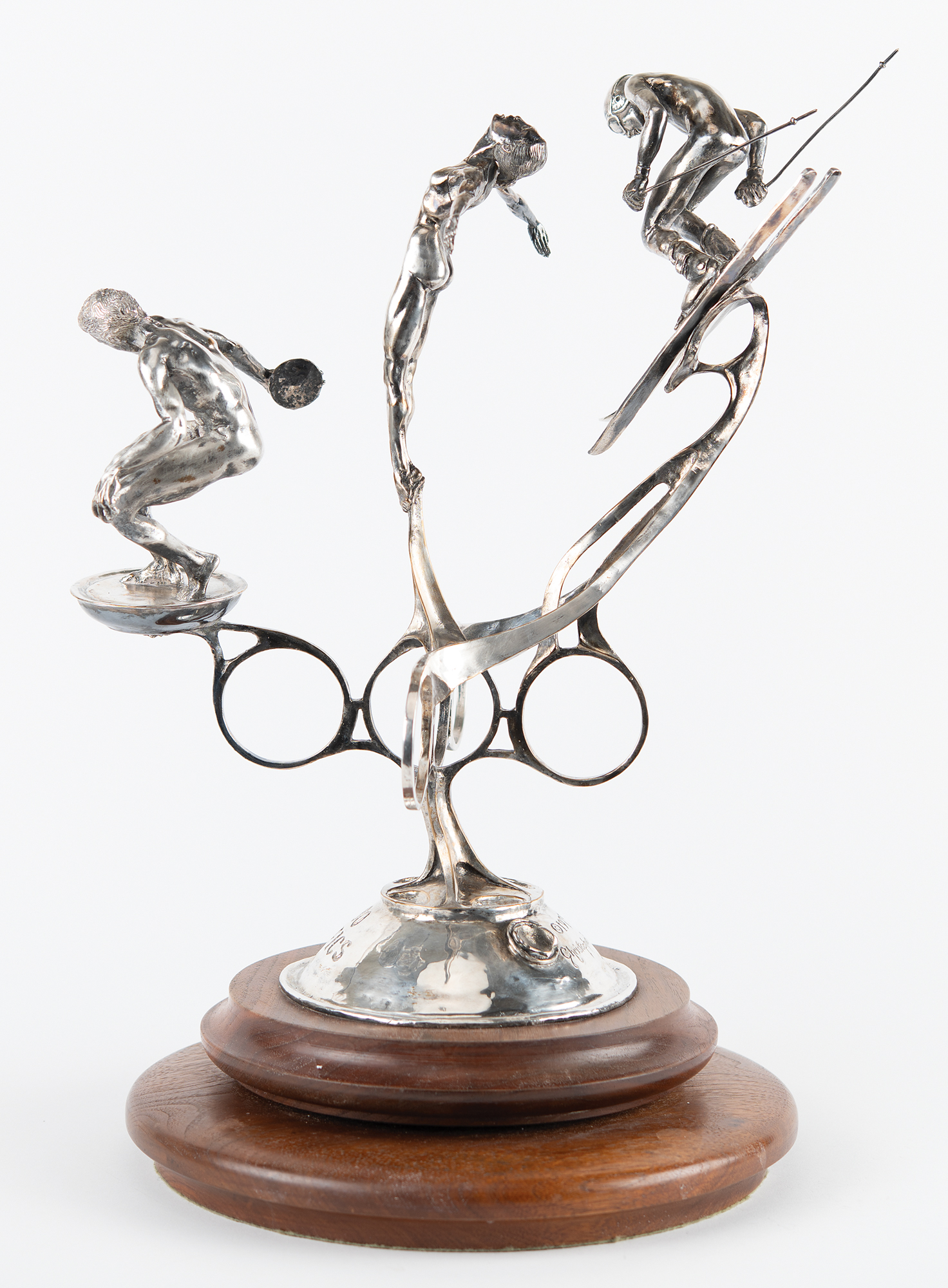Attractive limited edition sculpture honoring America in the 1980 Olympic Games, which were held in Lake Placid and Moscow. The sculpture, evidently cast in silver over bronze, stands 19″ in height and weighs 14 pounds, and depicts three athletic figures: a discus thrower, a diver, and a downhill skier. These figures are set atop five Olympic rings surmounting a domed base with engraved text: “1980 Olympics U.S.A.” The opposite side of the base bears the artist’s name (Christopher Burton) and fingerprint signature, the copyright date (1979), and the edition number (1st / AP). The sculpture is mounted to an 11″ wooden base with a rotatable upper platform. In fine condition, with scattered light scuffs and marks.