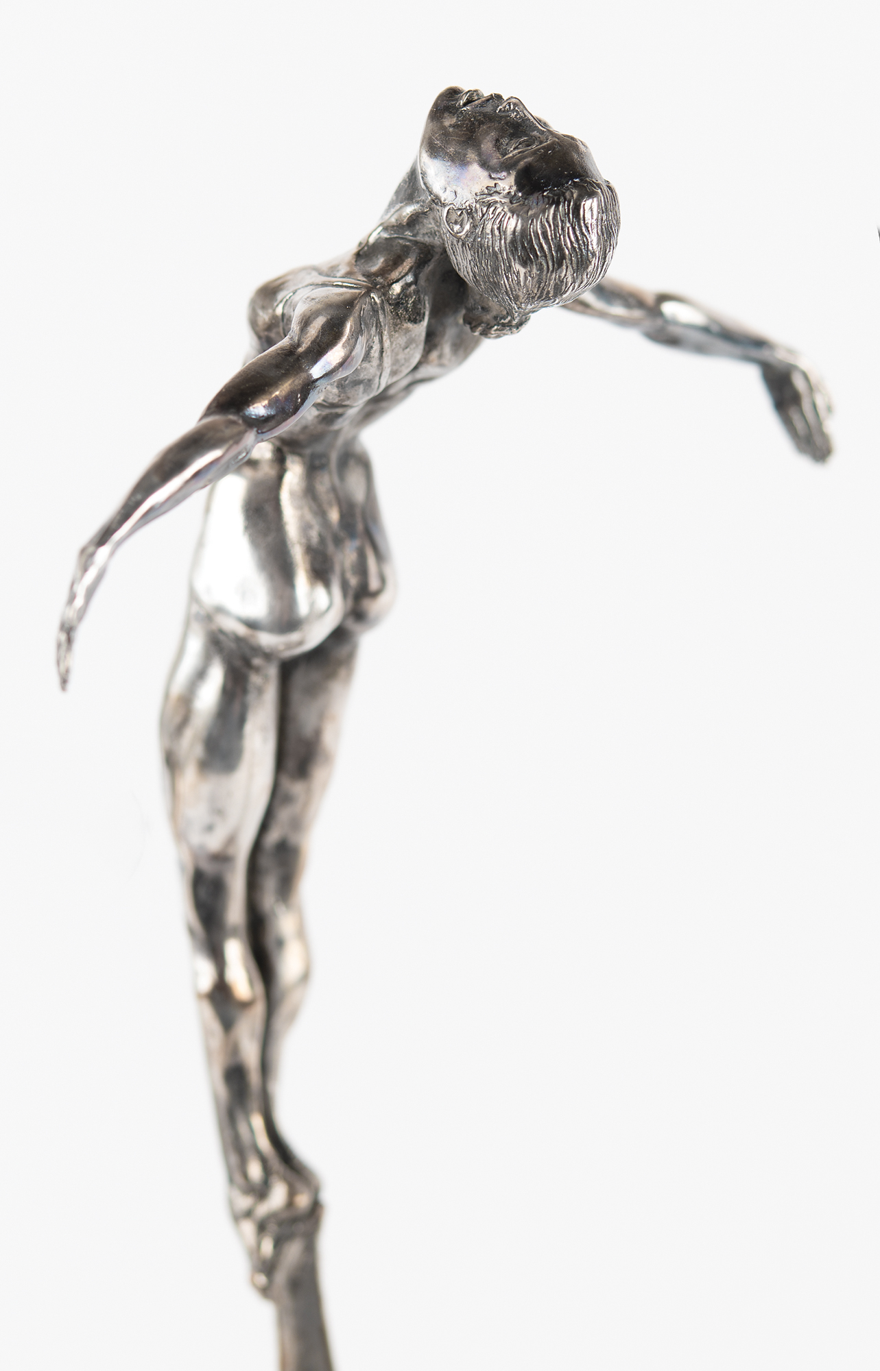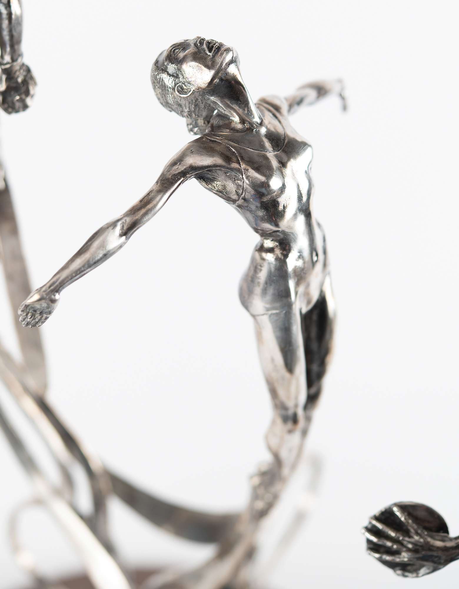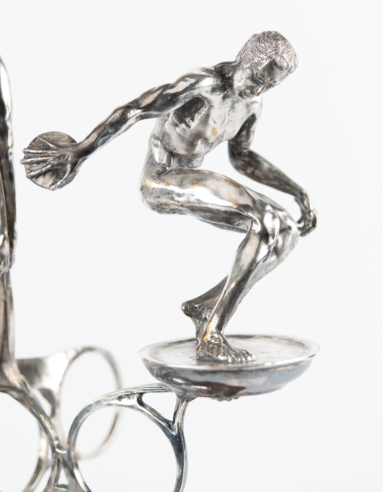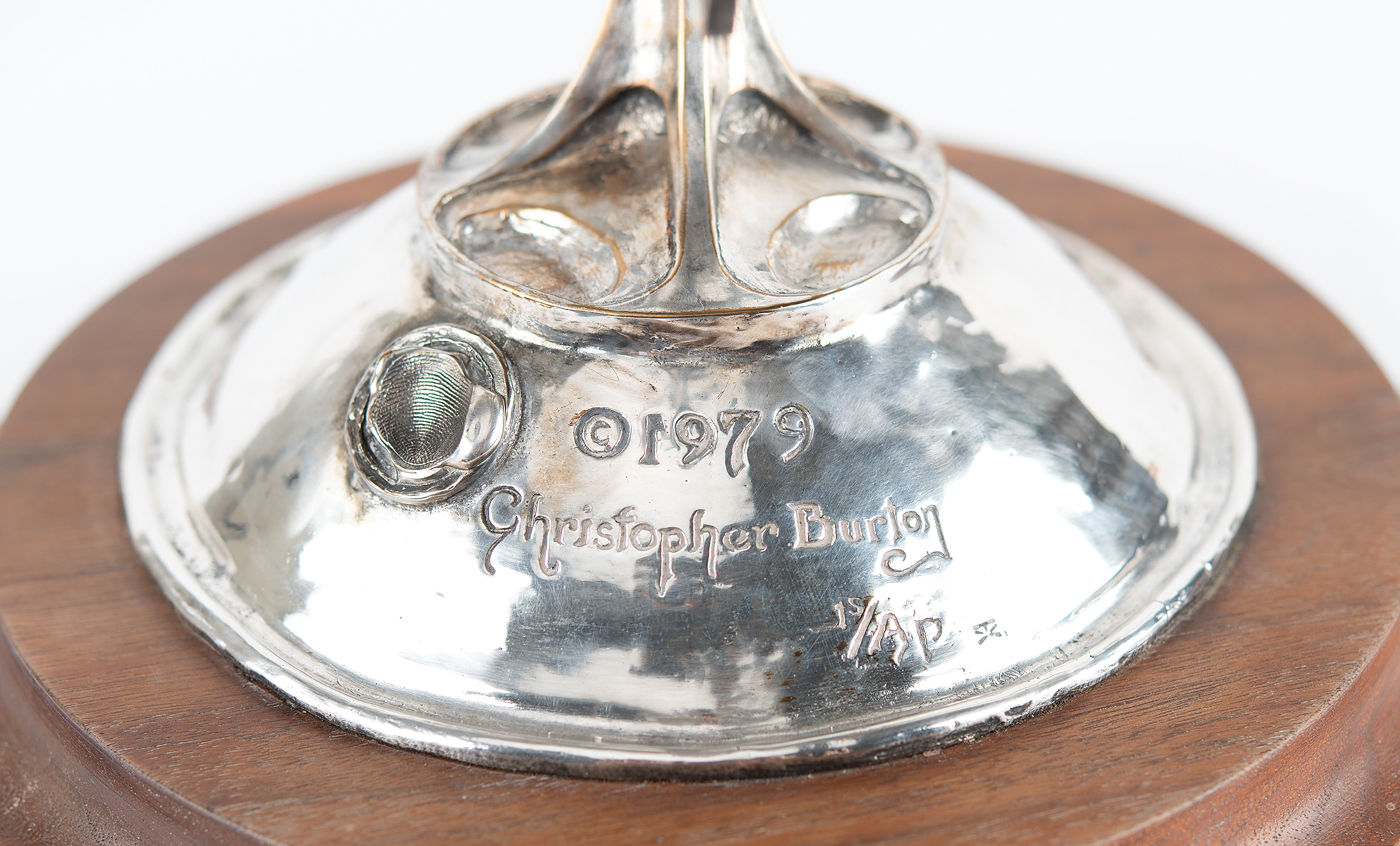 Attractive limited edition sculpture honoring America in the 1980 Olympic Games, which were held in Lake Placid and Moscow. The sculpture, evidently cast in silver over bronze, stands 19″ in height and weighs 14 pounds, and depicts three athletic figures: a discus thrower, a diver, and a downhill skier. These figures are set atop five Olympic rings surmounting a domed base with engraved text: “1980 Olympics U.S.A.” The opposite side of the base bears the artist’s name (Christopher Burton) and fingerprint signature, the copyright date (1979), and the edition number (1st / AP). The sculpture is mounted to an 11″ wooden base with a rotatable upper platform. In fine condition, with scattered light scuffs and marks.