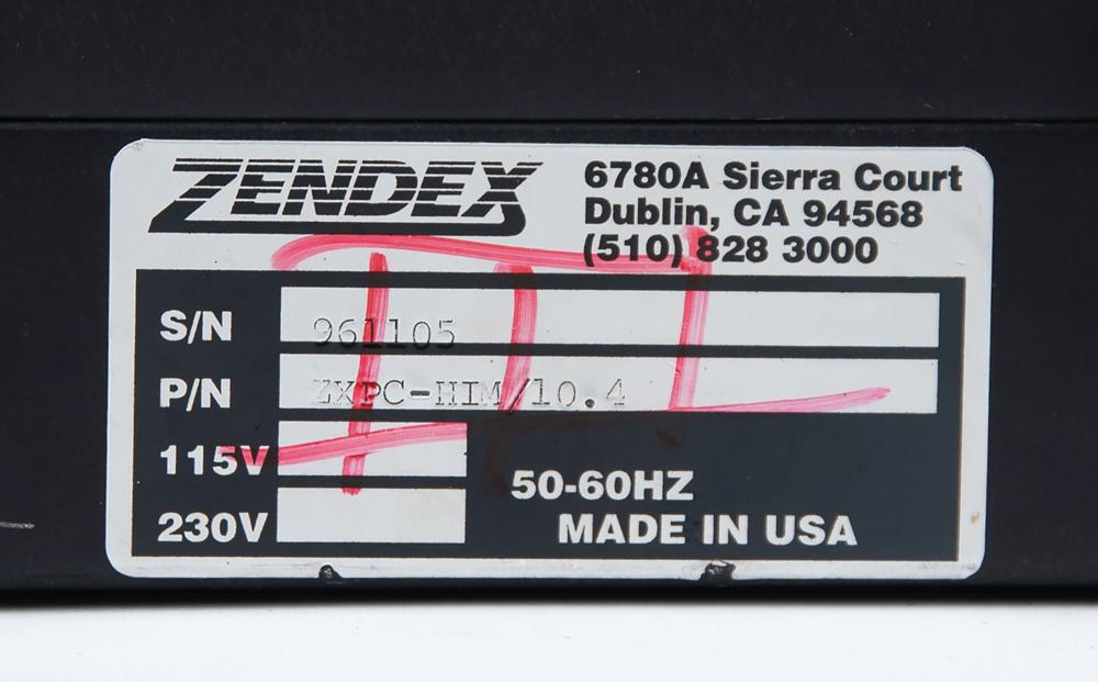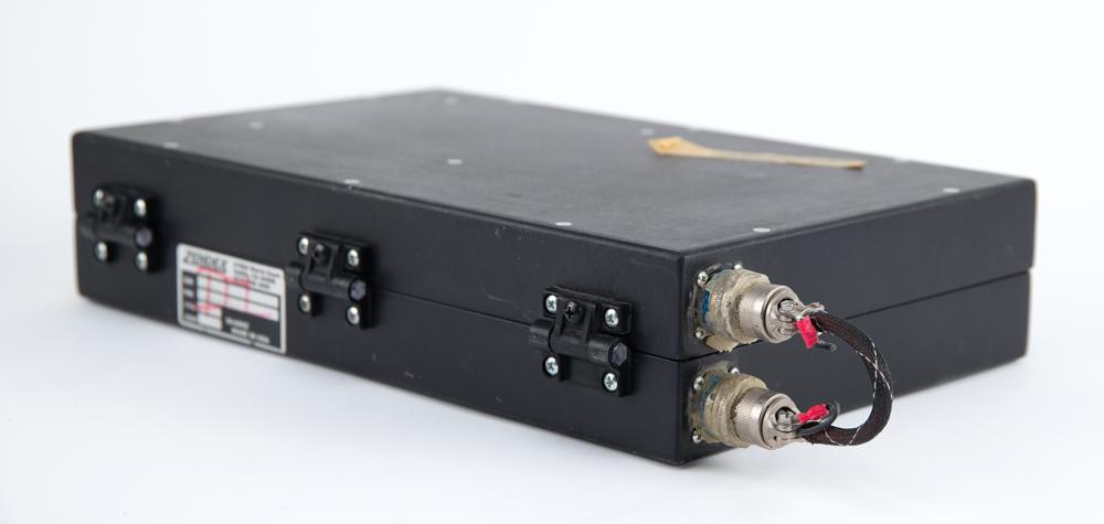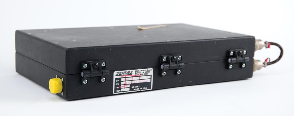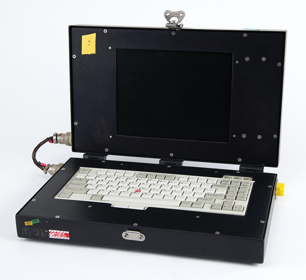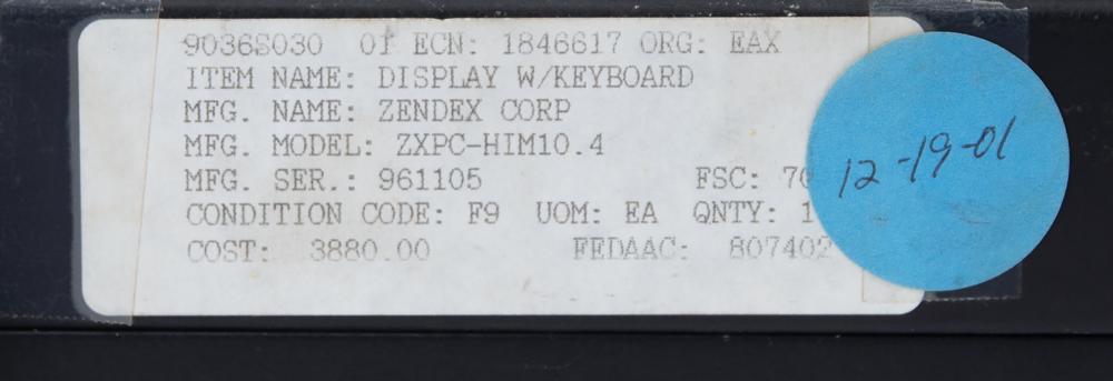 Laptop-style display with keyboard developed for an unknown application during an early phase of the Space Shuttle program, measuring approximately 15.5? x 9.5? x 3.5? closed, with latching lid and single power port on the right side. The metal housing opens to reveal a 10.5? screen and standard QWERTY keyboard with 'eraser tip' joystick mouse. The bottom bears three Velcro strips and is stenciled with part numbers, "SDD46114110-701, S/N 1005," and the rear panel bears a Zendex label, identifying it as "S/N 961105, P/N ZXPC-HIM/10.4." The front bears date stickers of "1997" and "1998," and a "Class III, Not for Flight" label. In fine condition.