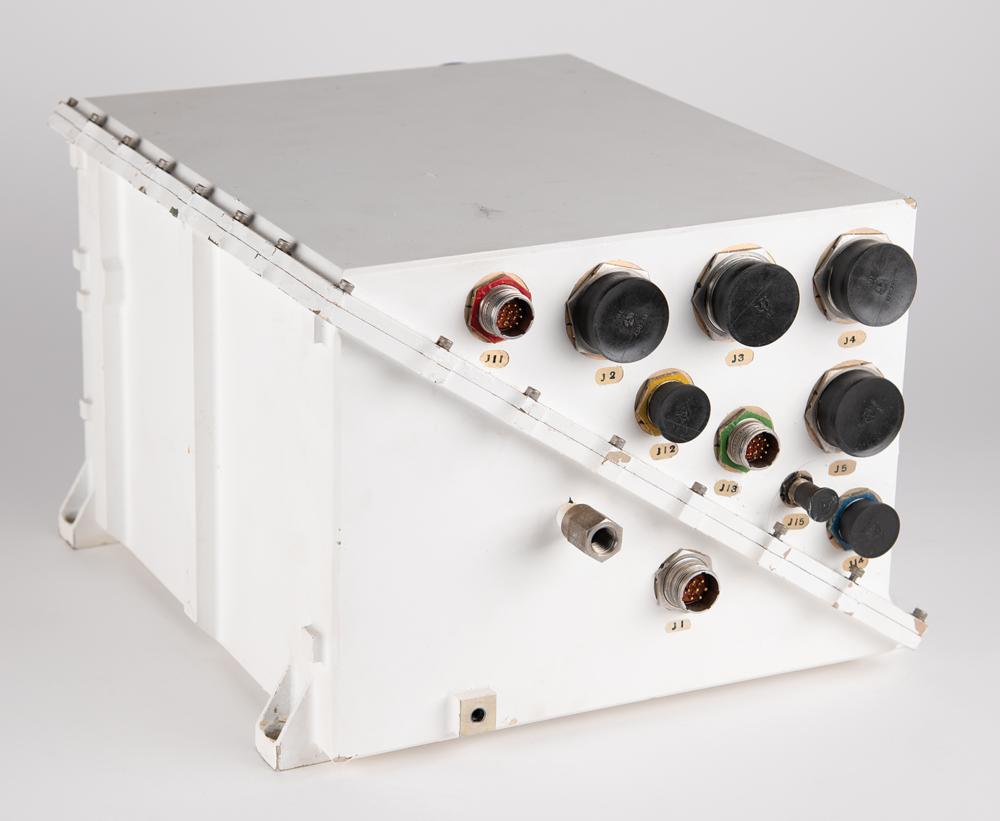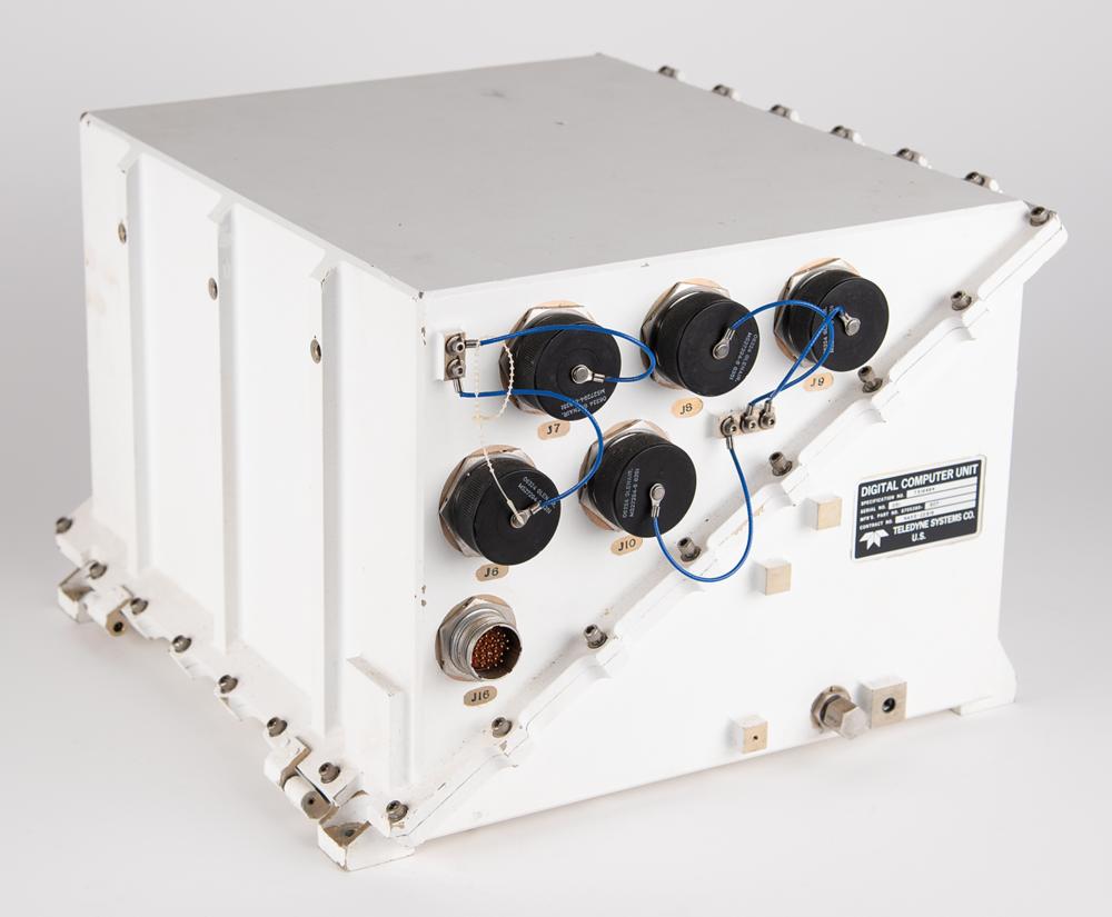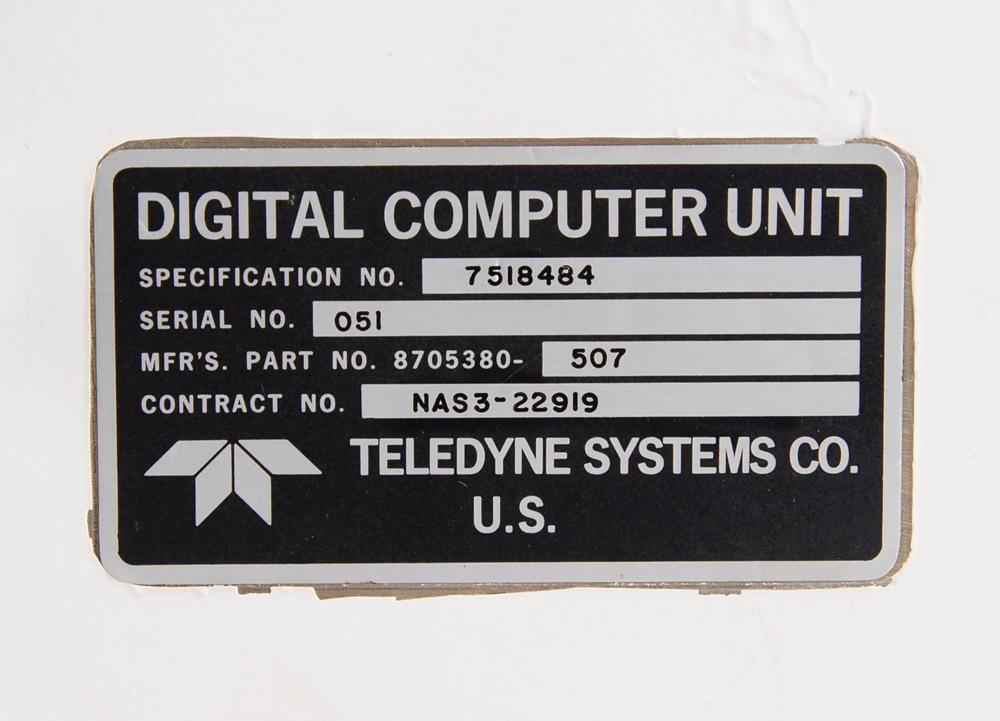 Substantial Digital Computer Unit (DCU) by Teledyne Systems, Co., measuring 14″ x 9.75″ x 15″ and weighing 58 lbs, with the front bearing the manufacturer’s parts label: “Digital Computer Unit, Specification No. 7518484, Serial No. 051, Mfr’s. Part No. 8705380-507, Contract No. NAS3-22919.” The front of the DCU features six ports and the backside contains another 10. In fine condition, with light scattered wear and scuffs.