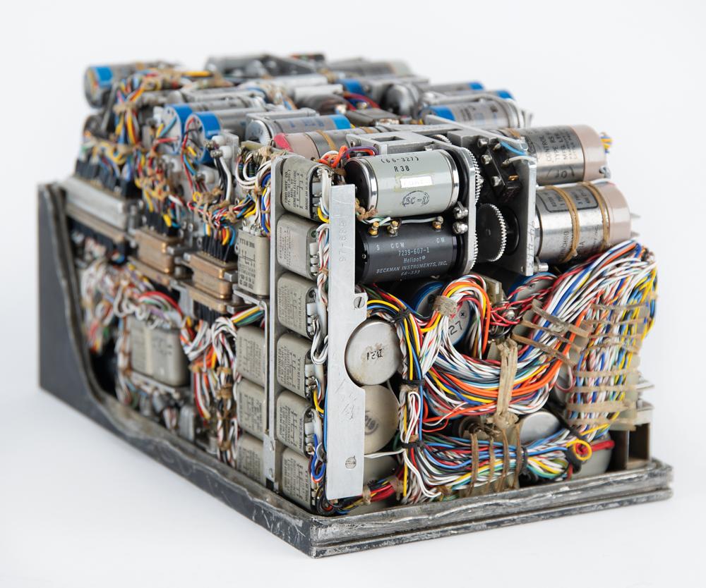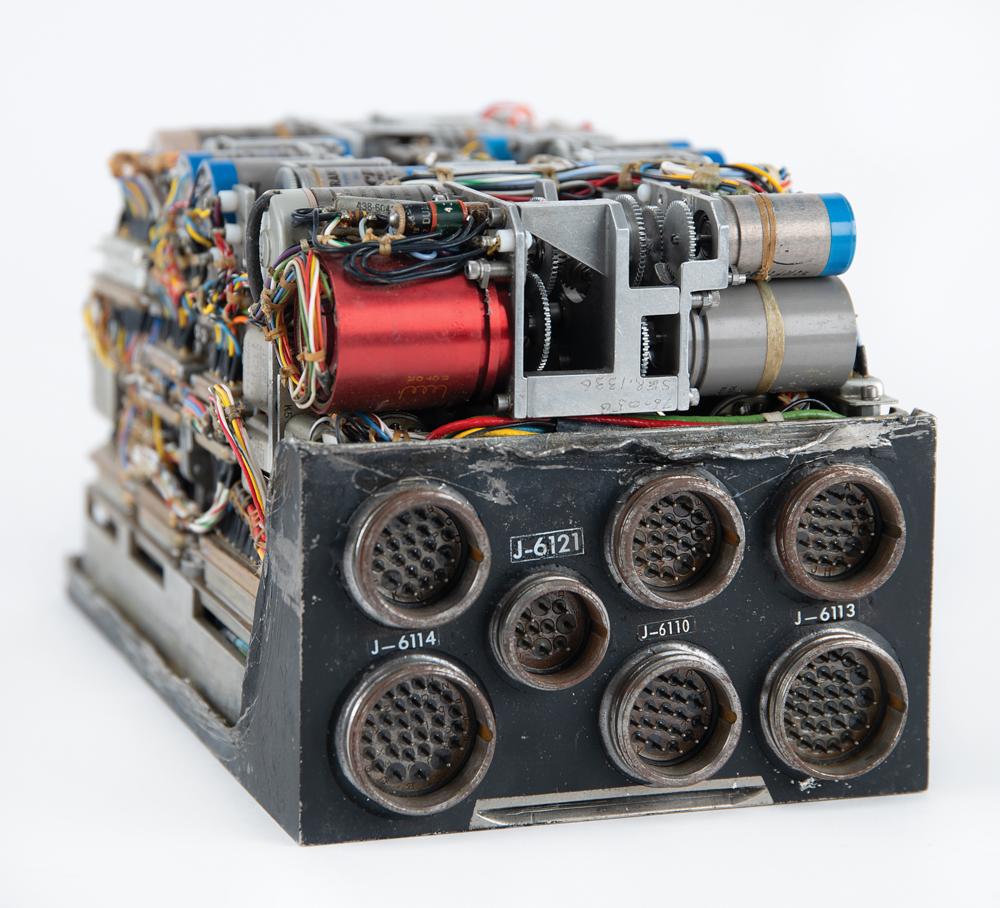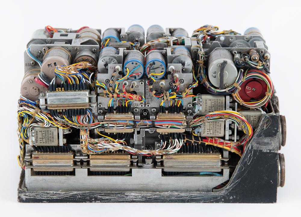 Unidentified but visually interesting electromechanical hardware (possibly of a military avionics application) filled with various synchro transmitters connected by gears, measuring 6″ x 5.5″ x 9.5″, featuring seven ports on the front. The housing has been cut away to reveal the various components and intricate, colorful wiring. In very good to fine condition.