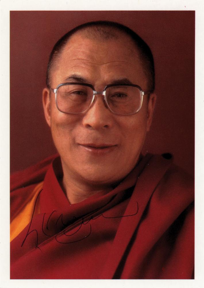 Color glossy 4 x 6 photo of the Dalai Lama in a pleasant up-close pose, signed in Tibetan in black ballpoint. In fine condition, with a very faint paperclip impression to the top edge.