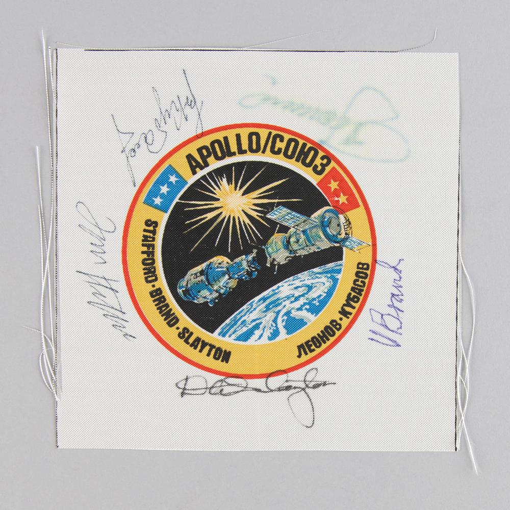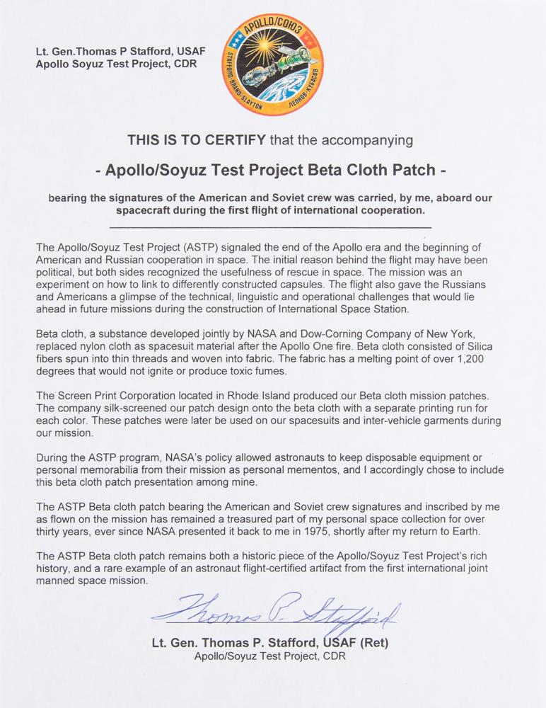 Tom Stafford’s flown 5.5″ x 5.5″ swatch of Beta cloth bearing a 3.5″ diameter emblem of the Apollo-Soyuz Test Project, signed around the insignia in black ink by Thomas Stafford, Deke Slayton, and Valeri Kubasov, in green ink by Alexei Leonov, and in purple ink by Vance Brand. Includes a signed letter of authenticity from Commander Stafford, in part: “This is to certify that the accompanying Apollo/Soyuz Test Project Beta Cloth Patch bearing the signatures of the American and Soviet crew was carried, by me, aboard our spacecraft during the first flight of international cooperation?During the ASTP Program, NASA’s policy allowed astronauts to keep disposable equipment or personal memorabilia from their mission as personal mementos, and I accordingly chose to include this beta cloth patch presentation among mine. The ASTP Beta cloth patch bearing the American and Soviet crew signatures?has remained a treasured part of my personal space collection for over thirty years, ever since NASA presented it back to me in 1975, shortly after my return to Earth.” In fine condition, with slight haloing to Leonov's signature. The ASTP Beta cloth patch remains both a historic piece of the Apollo-Soyuz Test Project’s rich history which ended the Cold War human space race, and a rare example of an astronaut flight-certified artifact from the first international joint manned space mission.