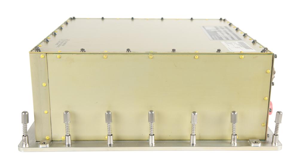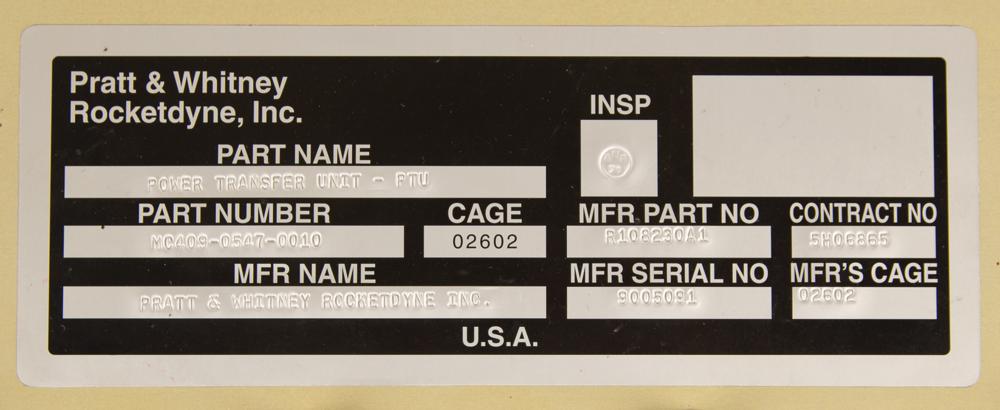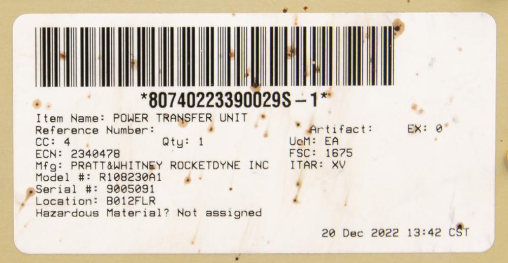 An unflown Space Shuttle Power Transfer Unit (PTU) manufactured by Pratt & Whitney Rocketdyne for the STS-118 mission, which featured the first flight of the new Station‐to‐Shuttle Power Transfer System (SSPTS), a series of electrical converter units designed to provide additional power to the Space Shuttle while docked with the ISS, consequently allowing it to extend its missions and perform more complex tasks. The PTU, which measures 20″ x 7.5″ x 20″ and weighs 70 lbs, features a series of eight ports to the front and a Pratt & Whitney Rocketdyne label to the top: “Part Name: Power Transfer Unit - PTU, Part Number: MC409-0547-0010, Cage: 20602, Mfr. Part No.: R108230A1, Contract No.: 5H06865, Mfr. Name: Pratt & Whitney Rocketdyne Inc., Mfr. Serial No.: 9005091, Mfr’s Cage: 02602.” Also present to the top is a bar code label with parts information and an “XV” ITAR number, and a North American stamp that reads: “S/N 9003160, 02602-R108242-1, MFR 48458.” The right side bears a similar stamp: “S/N 9003149, 02602-R108233A2, MFR 48458.” In fine condition. Accompanied by its heavy-duty transportation case by Hardigg Cases / A&J Cases, with several affixed NASA “Critical Space Item” labels and a “U.S. Government Property, The Boeing Company” label. The case, 36″ x 30.5″ x 35″, also bears a KSC Form serviceable parts tag, a Pratt & Whitney Rocketdyne parts label, an uncontrolled hardware label, and a “Super Clean Pack” label, all of which feature numbers that match with the PTU.