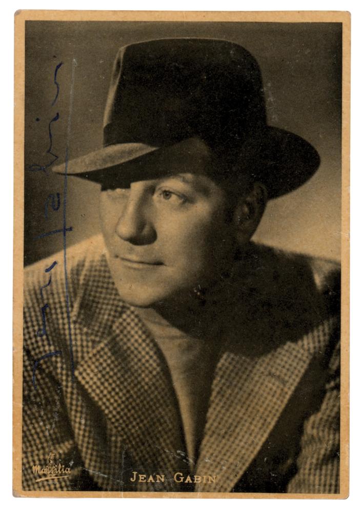 Vintage 3 x 4.5 Massilia collector's card of Jean Gabin looking cool in a fedora, signed vertically in fountain pen. In fine condition.