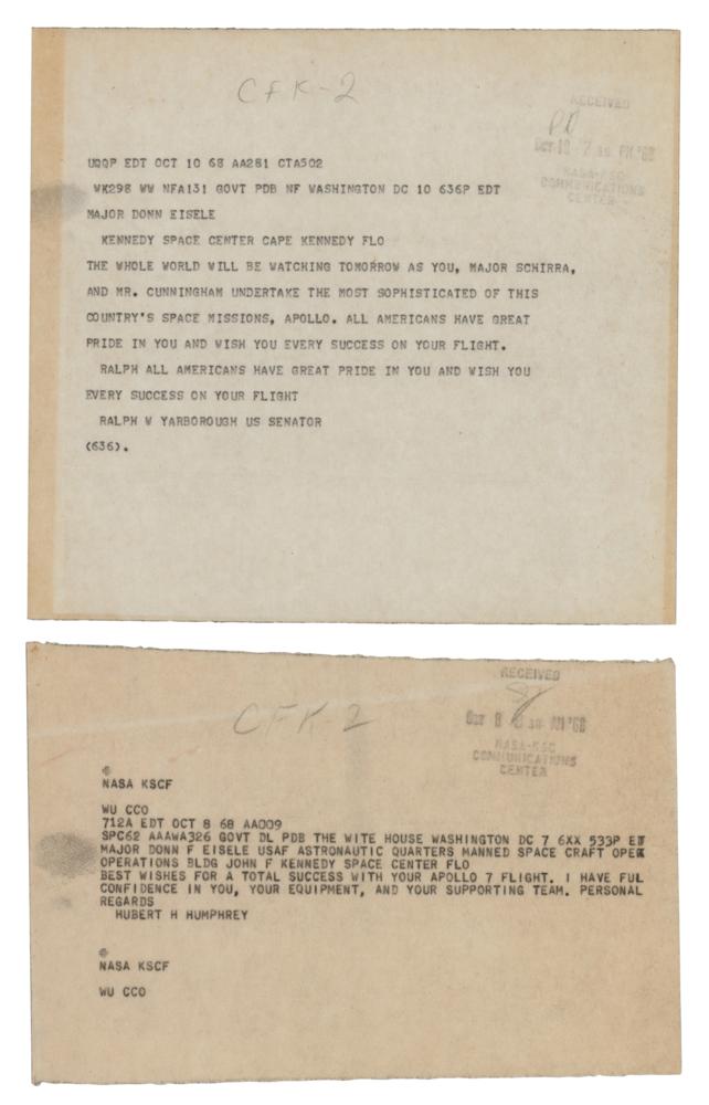 Two carbon teletype messages received by Apollo 7 Command Module Pilot Donn Eisele prior to the launch of the Apollo program’s first manned mission. The first, 8.5 x 5.75, October 8, 1968, sent to Eisele by Vice President of the United States, Hubert Humphrey, who writes (spelling retained): “Best wishes for a total success with your Apollo 7 flight I have ful confidence in you, your equipment, and your supporting team.” The second, 8.5 x 7.75, sent by Texas Senator Ralph Yarborough, reads: “The whole world will be watching tomorrow as you, Major Schirra, and Mr. Cunningham undertake the most sophisticated of this country’s space missions, Apollo. All Americans have great pride in you and wish you every success on your flight.” In overall fine condition.