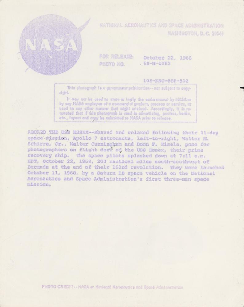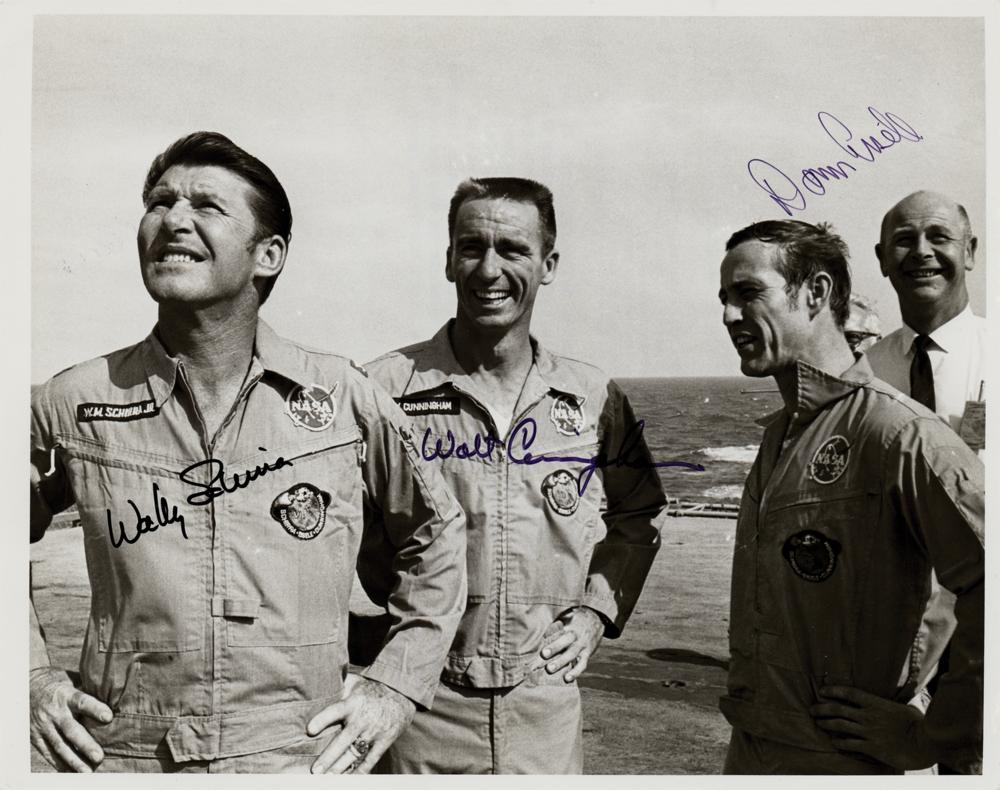 Official glossy 10.25 x 8 NASA photo of the Apollo 7 crew posing together on the deck of the recovery ship USS Essex after their successful mission, signed in felt tip by Wally Schirra, Walt Cunningham, and Donn Eisele. Reverse bears NASA caption text. In fine condition, with a few small corner creases.