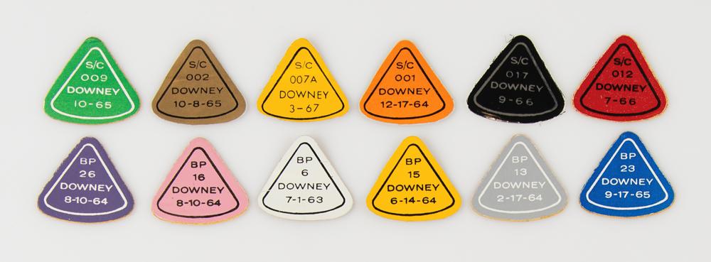 Group lot of 12 multicolored Apollo Command Module decals issued by CM prime contractor North American Aviation out of Downey, California. Each capsule-shaped decal measures 1.25 x 1.25, with six related to Boiler Plates (BP) 6, 13, 15, 16, 23, and 26, and six related to Block I Spacecraft (S/C), including 001, 002, 007A, 009 (AS-201 flight), 012 (the ill-fated Apollo 1 mission), and 017 (Apollo 4 flight). In overall fine condition.