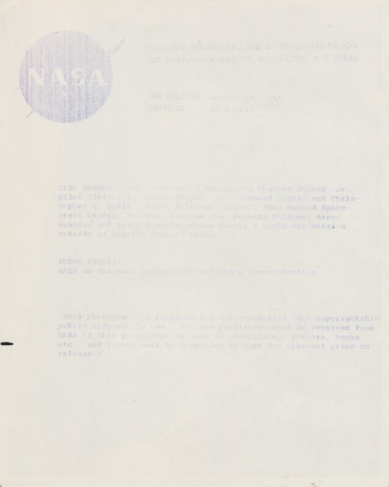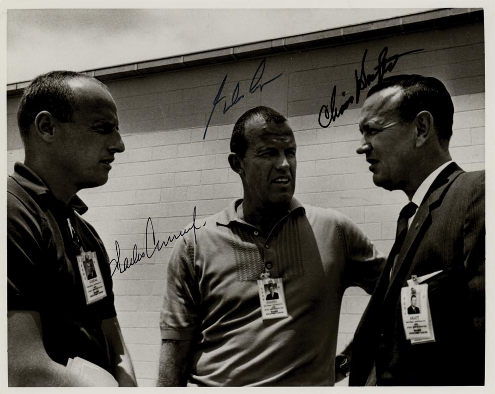 Official glossy 10 x 8 NASA photo of the crew of the Gemini 5 mission speaking with NASA's first flight director, signed in black felt tip by all pictured: Charles Conrad, Gordon Cooper, and Chris Kraft. Reverse bears NASA caption text. In very fine condition.