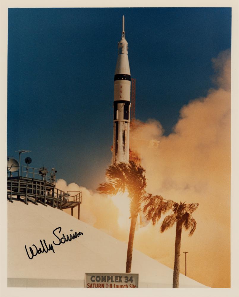 Color satin-finish 8 x 10 photo of the launch of the Apollo 7 mission on October 11, 1968, signed in black felt tip by Wally Schirra. In fine condition, with very slight lifting of the ink in the signature.
