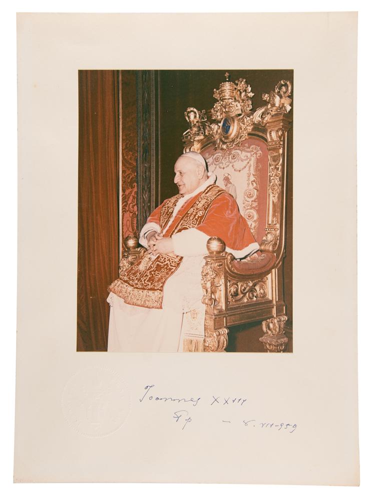 Italian Pope (1881-1963), born Angelo Giuseppe Roncalli, who ascended the papal throne in 1958 and served until his death. As the guiding force behind the historic Second Vatican Council, John ushered in the most sweeping reforms the Catholic Church had undergone in centuries. Vintage color glossy 7 x 9 photo of Pope John XXIII seated in his cathedra, affixed to its original 11 x 15 mount, which is signed below in ink, "Joannes XXIII, PP -8. VII - 959." In fine condition.