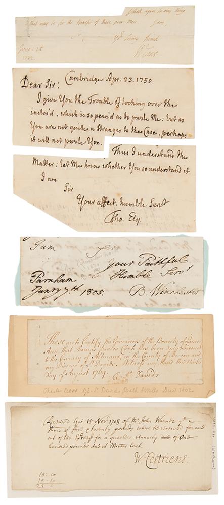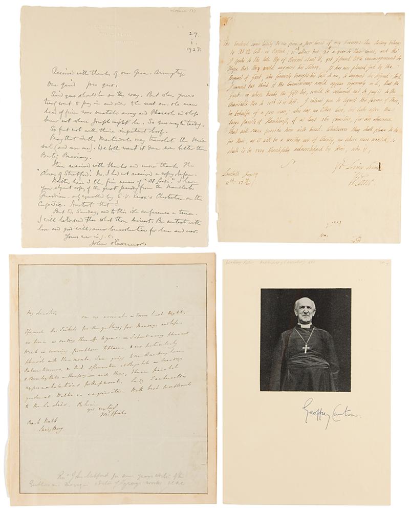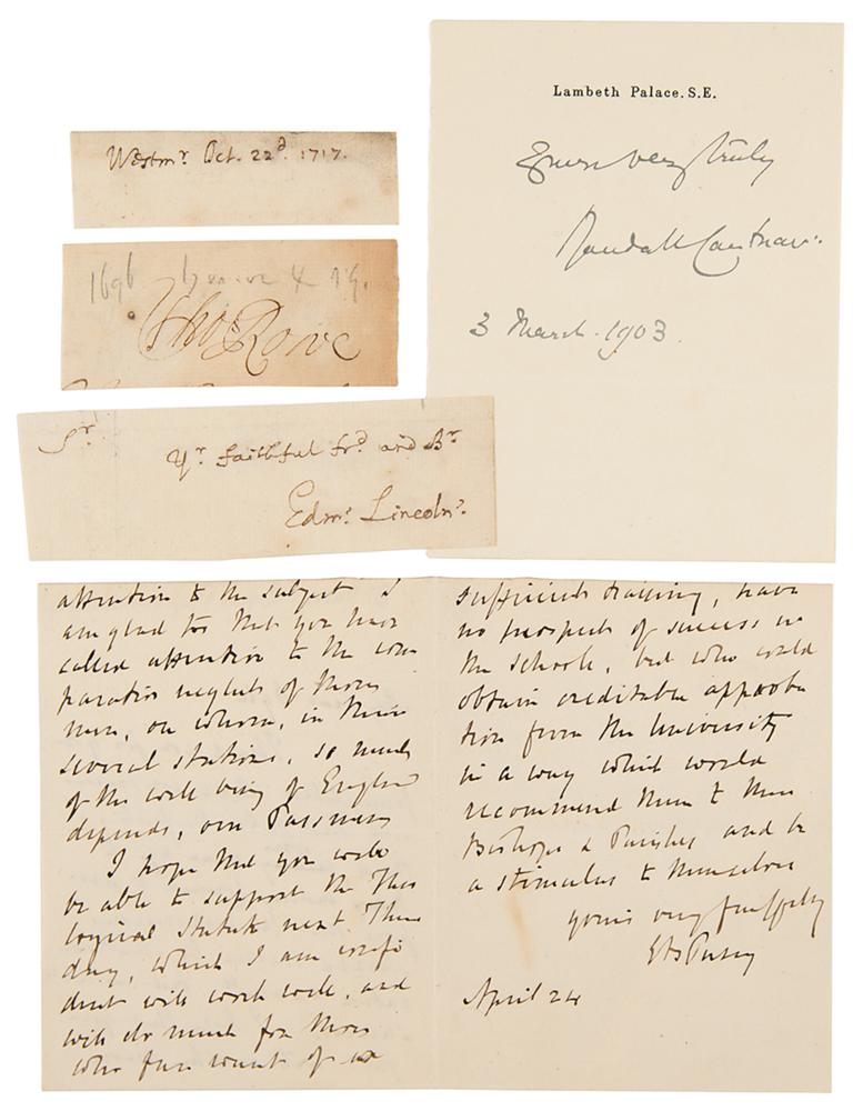 Collection of 22 items signed by a notable English religious leader, including: Randall Davidson, the Archbishop of Canterbury (signature); William Dawes, Bishop of Chester and then Archbishop of York (DS); Geoffrey Fisher, the Archbishop of Canterbury (SP); Edmund Gibson, Bishop of Lincoln (signature); Thomas Gooch, English bishop (ALS); Hugh Price Hughes, Welsh Methodist clergyman and religious reformer (ALS); William Inge, English author, Anglican priest, professor of divinity at Cambridge, and dean of St Paul's Cathedral (ALS); John Mitford, English clergyman and man of letters (ALS); Charles Moss, Anglican clergyman who served as Bishop of St David's and Bishop of Bath and Wells (DS); Brownlow North, English evangelist (signature); John O'Connor, Irish Catholic parish priest in England who was the basis of G. K. Chesterton's fictional detective Father Brown (ALS); Edward Bouverie Pusey, Anglican cleric and the Regius Professor of Hebrew at the University of Oxford for more than 50 years (ALS); Thomas Rowe, English nonconformist minister (signature); Archibald Campbell Tait, the Archbishop of Canterbury (2 ALSs); Frederick Temple, the Archbishop of Canterbury (AQS); Charles Voysey, former priest of the Church of England who was condemned by the Privy Council for heterodoxy and went on to found a theist church (3 ALSs); William Wake, the Archbishop of Canterbury (2: ADS and ANS); and Charles Lindley Wood, British Anglo-Catholic ecumenist who served as president of the English Church Union (ALS). In overall fine condition.