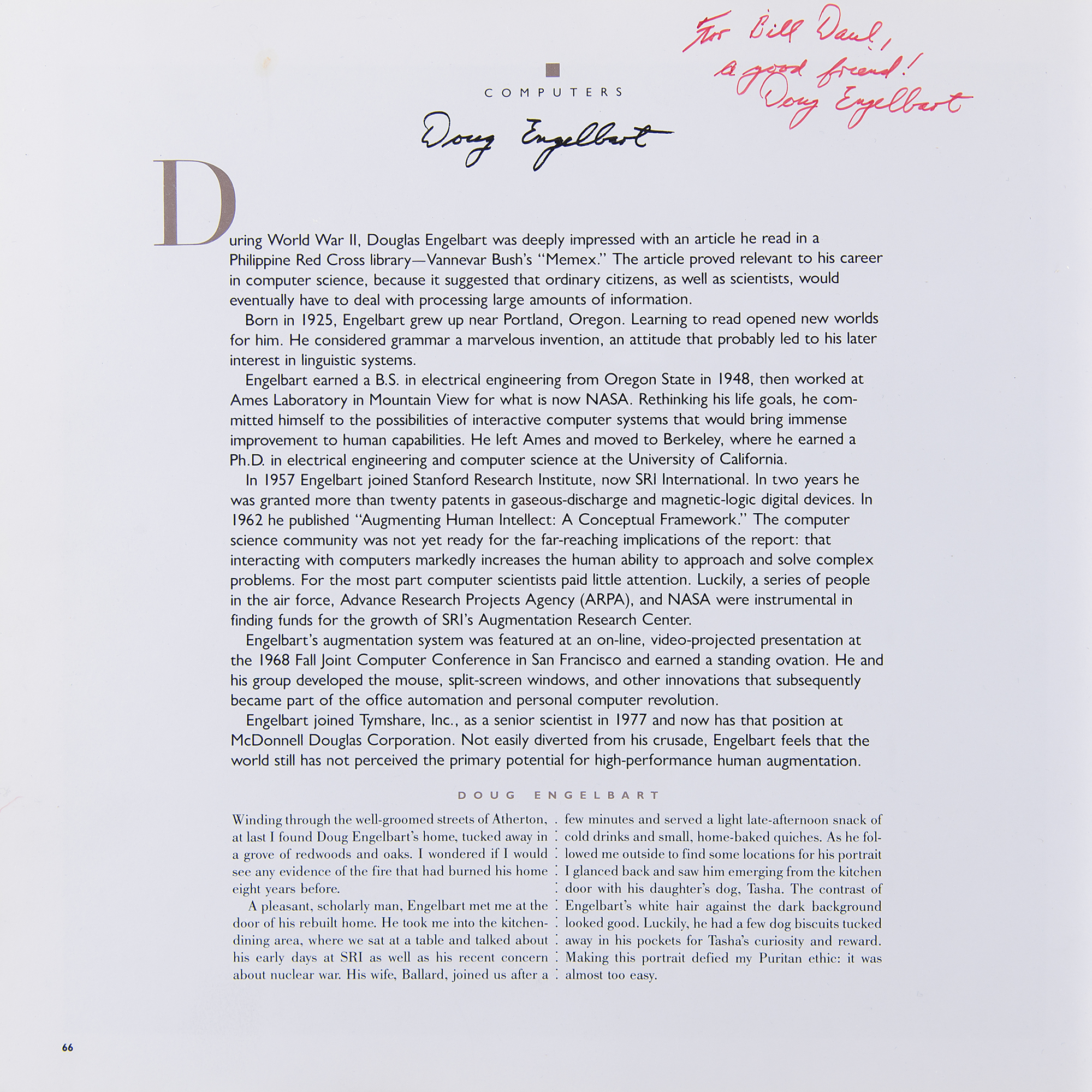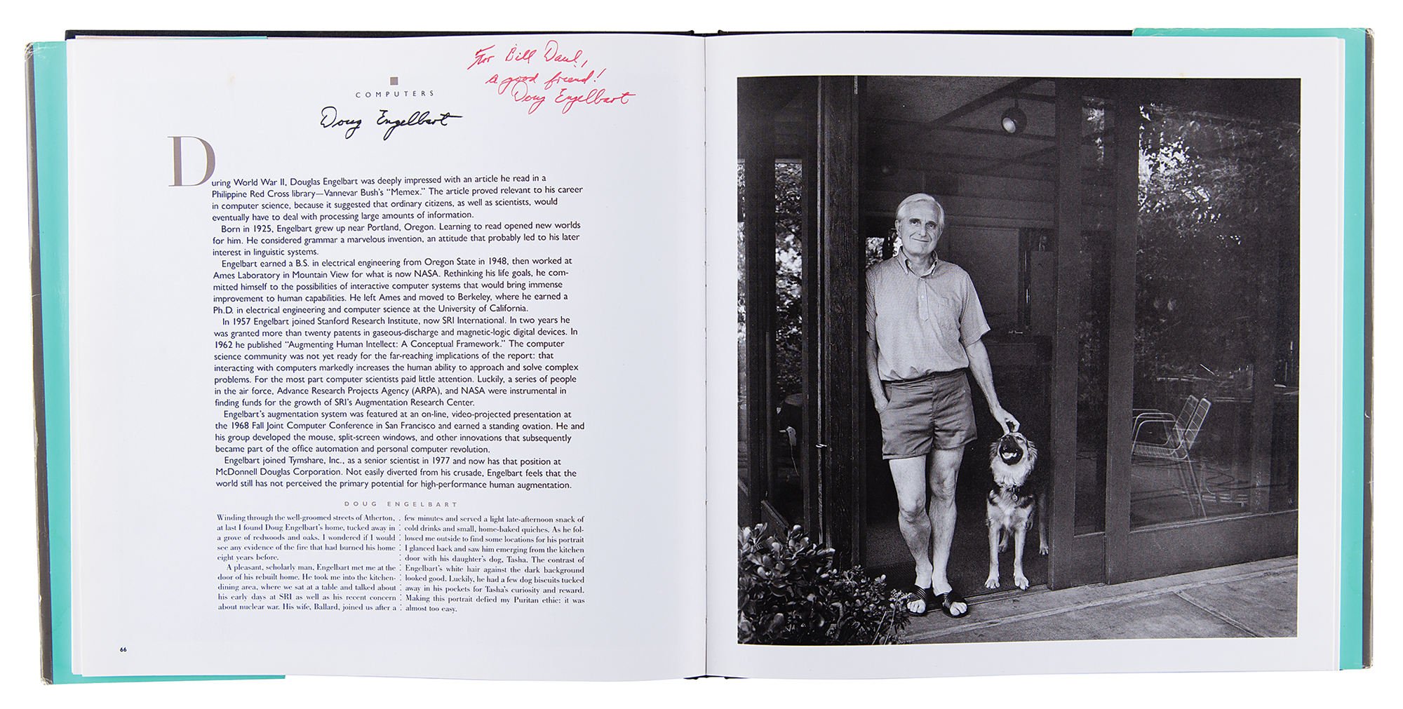 Signed book: Portraits of Success: Impressions of Silicon Valley Pioneers by Carolyn Caddes. First edition. Palo Alto, CA: Tioga Publishing, 1986. Hardcover with dust jacket, 11.5 x 11.25, 138 pages. Signed and inscribed on his biography page in red felt tip, "For Bill Daul, a good friend! Doug Engelbart." The signed page also bears a black facsimile signature, and the half-title page is signed by the book's author. In fine condition, with scattered wear to the dust jacket.