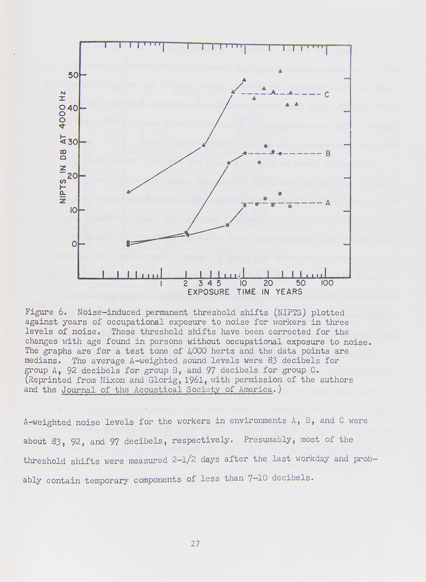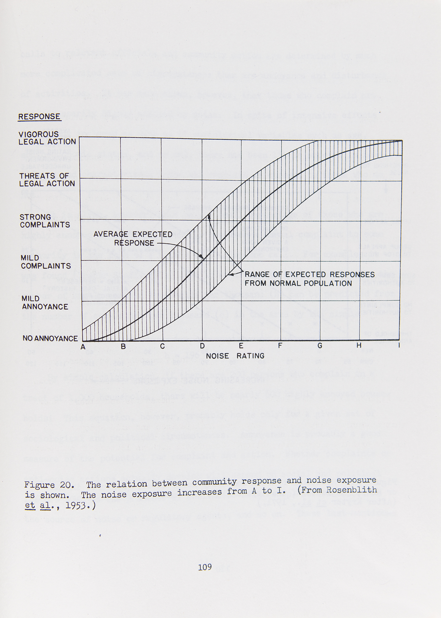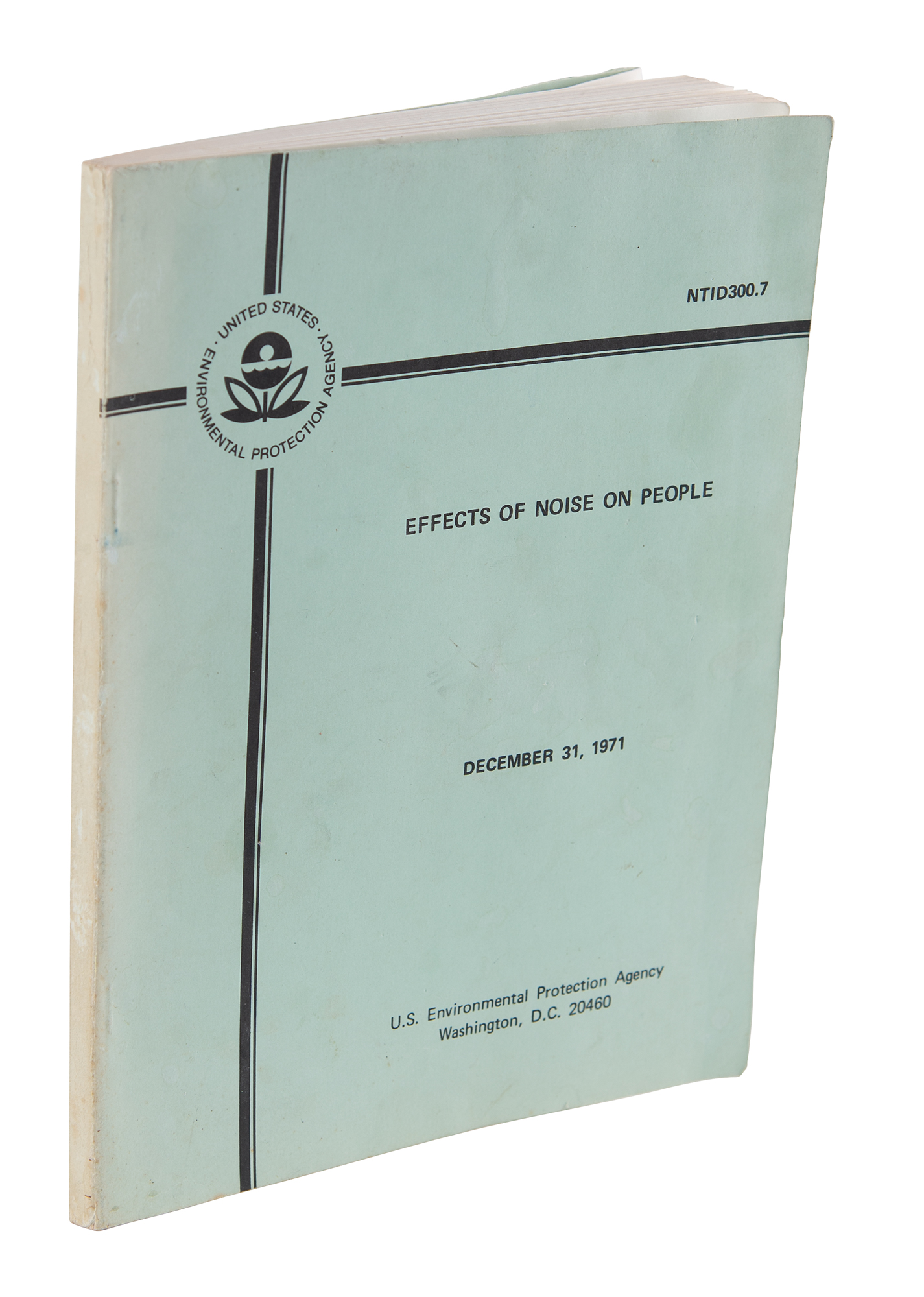 Uncommon report from the United States Environmental Protection Agency entitled “Effects of Noise on People” (NTID300.7), December 31, 1971, 153 pages, 8 x 10.5, prepared by the Central Institute for the Deaf. The report contains three parts, with each part made up of several sections, which include: Part I: Auditory Effects (Ear Damage and Hearing Loss; Masking and Interference with Speech Communication), Part II: General Psychological and Sociological Effects (Interference with Sleep; Loudness, Perceived Noisiness, and Unacceptability; Annoyance and Community Response, Other Possible Psychological and Sociological Effects), and Part III: General Physiological Effects (Transient and Possible Persistent Physiological Responses to Noise, Stress Theory, Health, and Noise).
