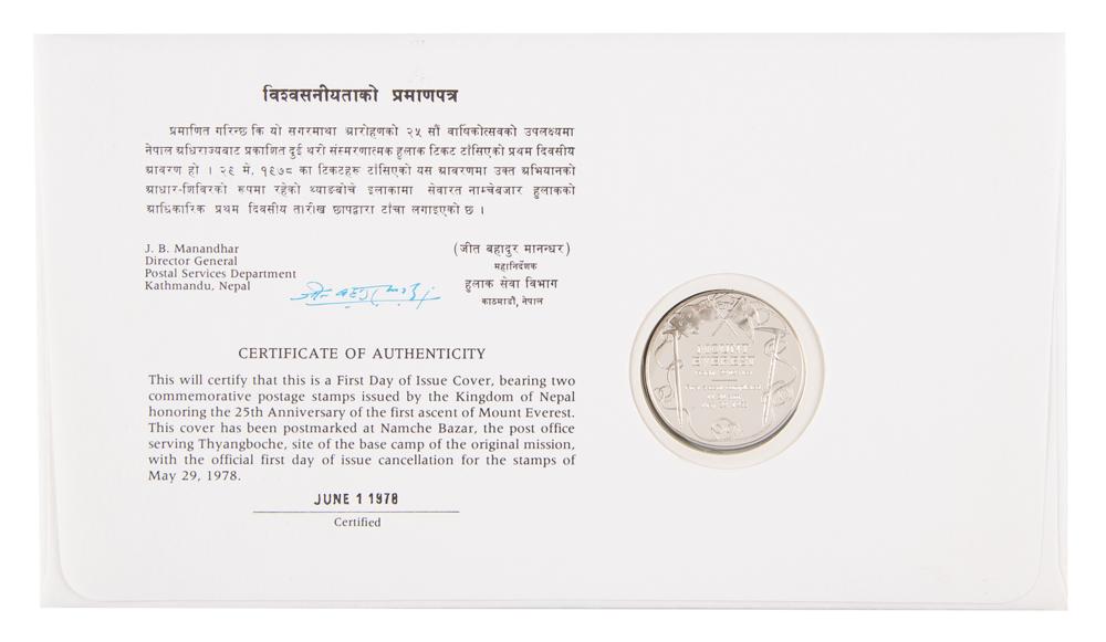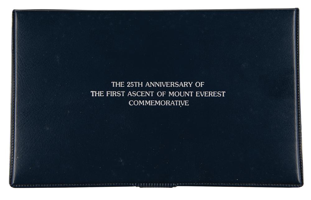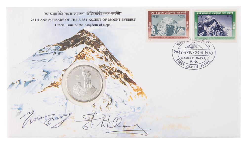 Commemorative cover with a cachet and inlaid medallion honoring the 25th anniversary of the first ascent of Mount Everest, 8 x 4.5, signed in black ballpoint by Edmund Hillary and Tenzing Norgay. Housed in its original presentation folder. In very fine condition.