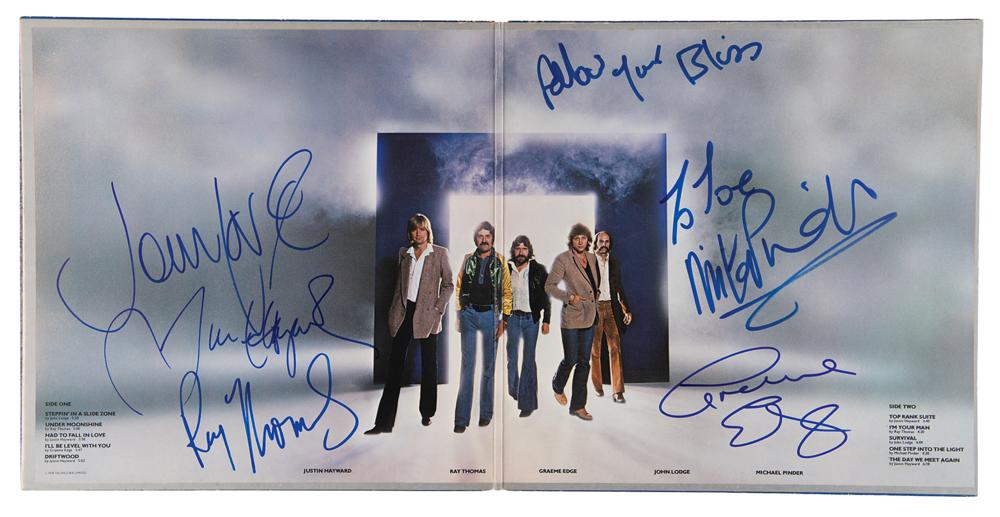 Octave album by The Moody Blues, signed and inscribed on the inner gatefold in blue felt tip, "Follow your bliss, To Joe, Mike Pinder," "Graeme Edge," "John Lodge," "Justin Hayward," and "Ray Thomas." In fine condition, with light edge wear. The record is included.