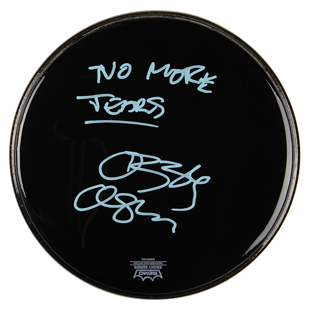 Black Ebony Series Remo Weather King Batter drum head, 13.75″ in diameter, signed in light blue paint pen, “No more tears, Ozzy Osbourne.” In fine condition. A sought-after format with a choice classic song / album addition by the adored Black Sabbath frontman.