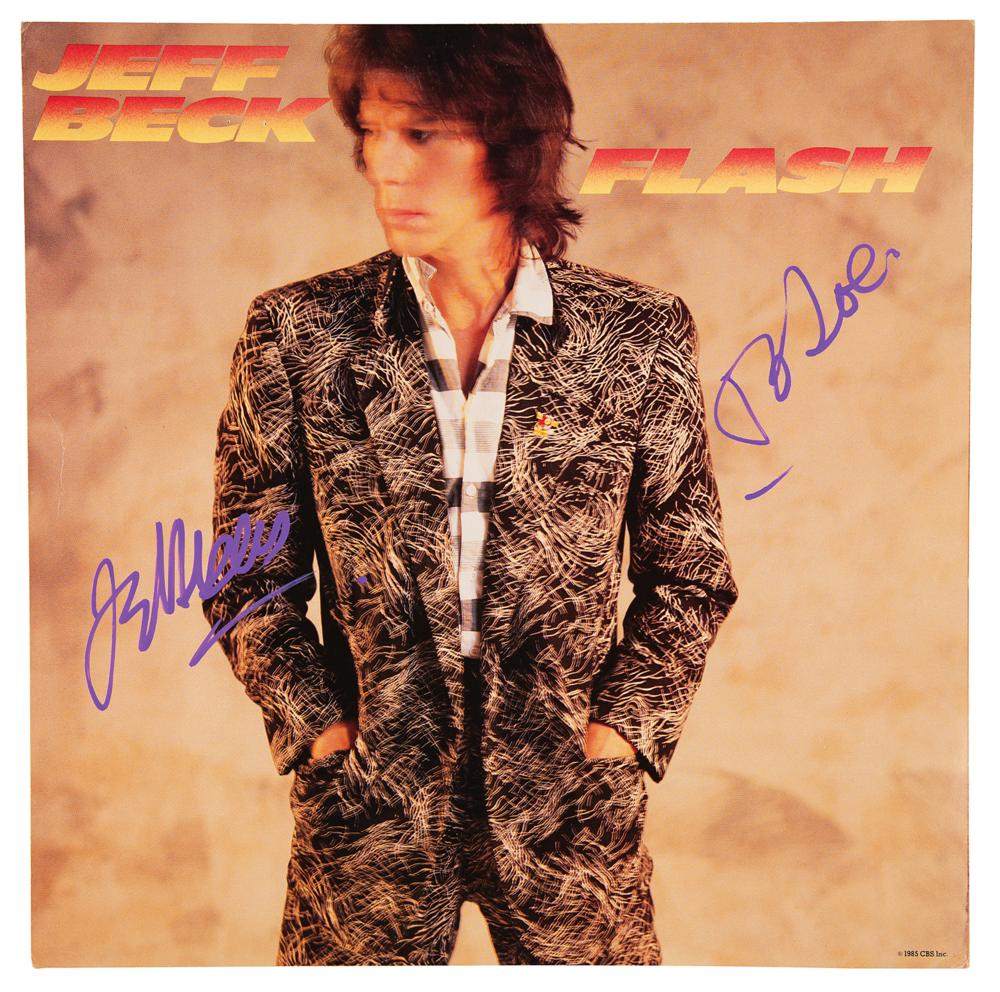 Album flat for the 1985 Jeff Beck album Flash, signed and inscribed in purple paint, “To Joe, Jeff Beck.” In fine condition, with some light edge creases. The record is not included.