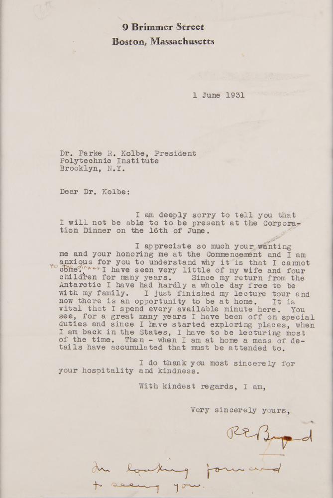 Two items signed by the polar aviator: a handsome pearl-finish 7 x 9.5 portrait by G. Maillard Kesslère, signed and inscribed in fountain pen, "To D. E. Walton, with cordial regards, R. E. Byrd, Feb. 9, 1931"; and a TLS signed "R. E. Byrd, In looking forward to seeing you," one page, 7 x 10.5, personal letterhead, June 1, 1931, to Parke R. Kolbe of the Polytechnic Institute, in part: "I appreciate so much your wanting me and your honoring me at the Commencement and I am anxious for you to understand why it is that I cannot come to the dinner. I have seen very little of my wife and four children for many years. Since my return from the Antarctic I have had hardly a whole day free to be with my family. I just finished my lecture tour and now there is an opportunity to be at home. It is vital that I spend every available minute here." Matted together to an overall size of 18 x 14. In fine condition, with some light creasing to the top of the letter.