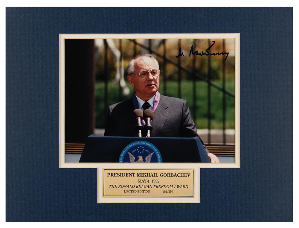 Color glossy 9.5 x 7 photo of Mikhail Gorbachev speaking after receiving the Ronald Reagan Freedom Award, signed in black felt tip. Double-matted as part of a limited edition display (numbered 192/250) to an overall size of 16 x 12. In fine condition.