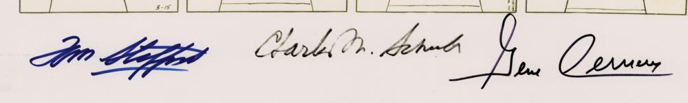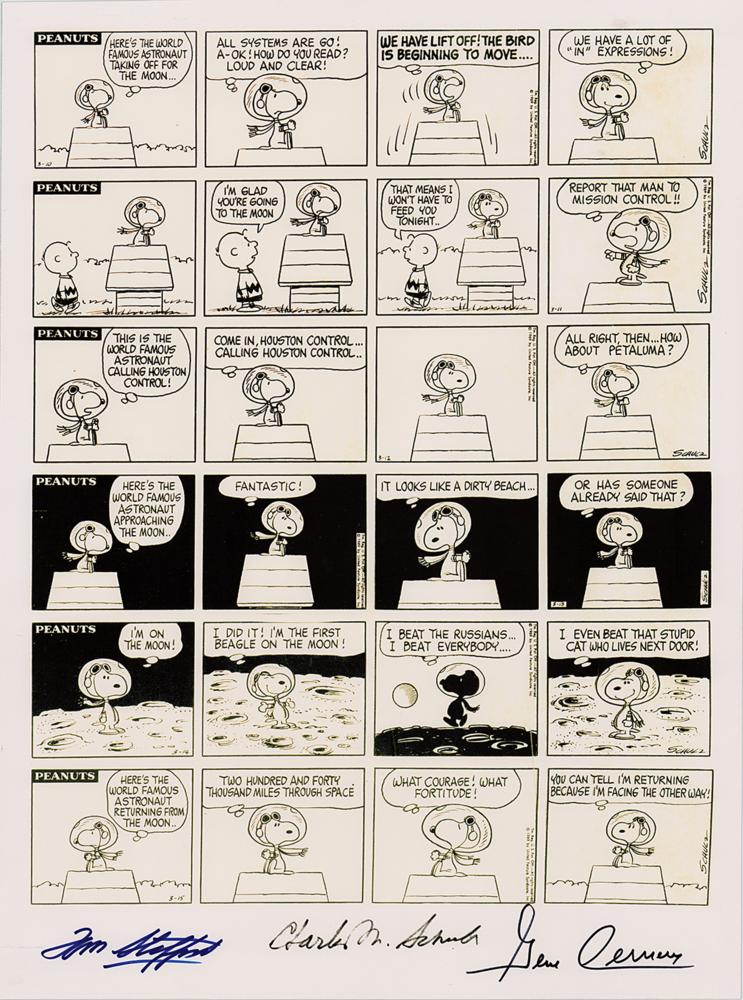 Desirable print of a Peanuts comic strip portraying Snoopy as an astronaut, 16.5 x 22, signed in the lower border in blue felt tip by Tom Stafford, and in black felt tip by Gene Cernan. Also bears the pre-printed facsimile signature of Charles Schulz. Rolled and in fine condition. The call signs for the Apollo 10 spacecraft were the names of characters Charlie Brown and Snoopy, the semi-official mascots of the famed 'dress rehearsal' Apollo mission, and Peanuts creator Charles Schulz also drew some mission-related artwork for NASA to encourage their spaceflight safety initiatives.